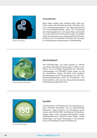 90 Hotline: +49(0)9561/2707-42InnovationenNeue Ideen spielen eine wichtige Rolle. Dazu geh%u00f6ren neben der Entwicklung neuer Produkte auch neue Herstellungsverfahren, die Weiterentwicklung von Produkteigenschaften sowie die Erweiterung des Materialspektrums. Auf dieser Basis entwickeln wir unser Sortiment kontinuierlich weiter und greifen dabei Anforderungen aus unterschiedlichen Einsatzbereichen auf. So entstehen Produkte und L%u00f6sungen Neueste Technologie f%u00fcr verschiedene Anwendungen im Arbeitsalltag.Umweltvertr%u00e4gliche MaterialienISO 9001/2008 zertifiziertNachhaltigkeitDen Anforderungen von heute gerecht zu werden und dabei zuk%u00fcnftige Entwicklungen im Blick zu behalten, ist ein wichtiger Bestandteil der Unternehmensstrategie von EICHNER. Daher setzen wir bei der Herstellung unserer Produkte unter anderem auf Materialien wie PP (Polypropylen) und PET (Polyethylenterephthalat) sowie auf Produktions- und Druckverfahren, die auf eine ressourcenschonende Verarbeitung ausgerichtet sind.Qualit%u00e4tDie Richtlinien und Prozesse f%u00fcr die Herstellung unserer Produkte orientieren sich an internationalen Standards. Deren Kenntnis und Einhaltung sowie unsere nach DIN ISO 9001 zertifizierten Produktionsst%u00e4tten bilden einen wichtigen Bestandteil unserer Qualit%u00e4tssicherung. Dar%u00fcber hinaus flie%u00dfen unsere Erfahrungen und unser Fachwissen in die Entwicklung und Herstellung unserer Produkte ein.