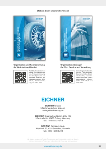 EICHNER Gruppehttp://www.eichner-org.comanfrage@eichner-org.deEICHNER Organisation GmbH & Co. KGUferstra%u00dfe 28, 96450 Coburg, GermanyTel.: +49-9561-2707-0EICHNER Termopol d.o.o.Koprivnik 50, 4225 Sovodenj, SloveniaTel.: +386-4-50635-00PR%u00c4SENTATION UND ORGANISATION F%u00dcR WERKSTATT UND BETRIEBSt%u00f6bern Sie in unserem Sortiment!Organisation und Kennzeichnung f%u00fcr Werkstatt und BetriebOrganisationsl%u00f6sungenf%u00fcr B%u00fcro, Service und VerwaltungPlantafeln, Kennzeichenverst%u00e4rker, Schl%u00fcsselorganisation, Preisauszeichnung, KFZ-Schutzprodukte und Formulare, Angebots- und Pr%u00e4sentationsmappen, RFIDSchutz, Betriebseinrichtung und vieles mehrOrdner, Ringb%u00fccher, Schuber,Mappen, H%u00e4ngemappen, Dokumentenh%u00fcllen, Selbstklebetaschen, Sammelboxen, Formulare, Visitenkartenzubeh%u00f6r, Klemmbretter RFID-Schutz und vieles mehrAlle Katalog-Angaben zu Preisen, Produkttexten und Produktbildern sind ohne Gew%u00e4hr.Irrt%u00fcmer und technische %u00c4nderungen vorbehalten. Alle Preise zzgl. Mehrwertsteuer. ORGANISATIONSL%u00d6SUNGEN F%u00dcR B%u00dcRO, SERVICE UND VERWALTUNGwww.eichner-org.de 91