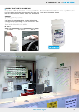 www.eichner-org.de 117Die Spenderbox enth%u00e4lt 200 Desinfektions- und Reinigungst%u00fccher zur Anwendung auf alkoholbest%u00e4ndigen Oberfl%u00e4chen. Die T%u00fccher haben eine Gr%u00f6%u00dfe von 215 %u00d7 215 mm und sind ohne Bleiche sowie geruchsneutral formuliert. Die Desinfektionst%u00fccher sind wirksam gegen Bakterien, Viren (HBV/HIV) und Pilze (Candida albicans).DESINFEKTIONST%u00dcCHER IN SPENDERBOX>>Anwendung:%u2022 Deckel der Spenderdose abnehmen%u2022 Den Beutel oben aufschneiden%u2022 Den Beutel in die Spenderdose stecken, T%u00fccher im Beutel belassen%u2022 Das erste Tuch aus der Mitte der Rolle durch die %u00d6ffnung im Deckel ziehen%u2022 Anschlie%u00dfend den Deckel wieder aufsetzen%u2022 Deckel nach der Tuchentnahme immer schlie%u00dfenVE = 1 DoseBest.-Nr. Tuchma%u00dfe Preis/VE9127-01819 215 x 215 mm %u20ac 19,6019,60 %u20ac/DoseHYGIENEPRODUKTE << EICHNER