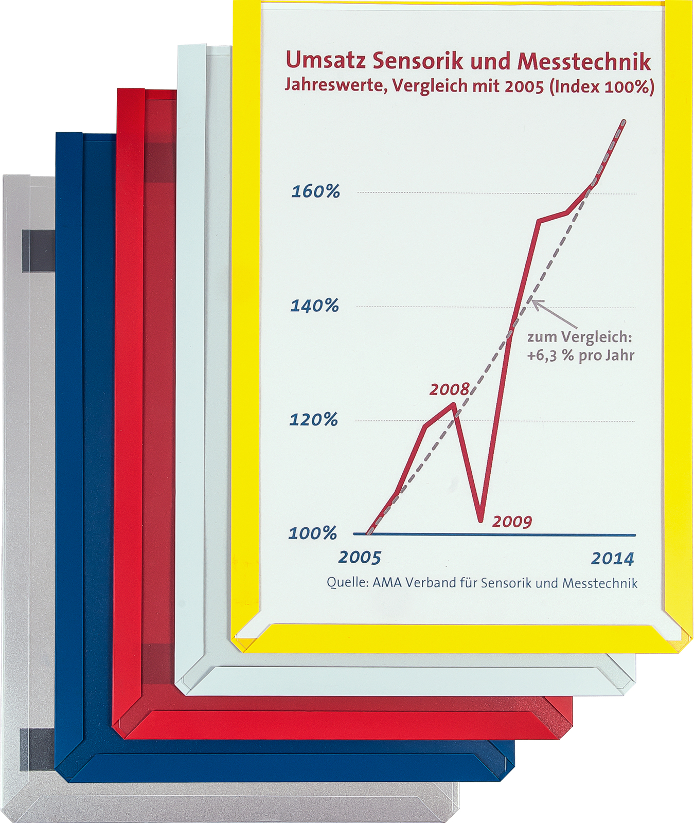 Transparent magnetic pouch made of rigid PVC, bevelled on three sides, strong magnetic strips on the back, various colours available in DIN A4 vertical + horizontal.
