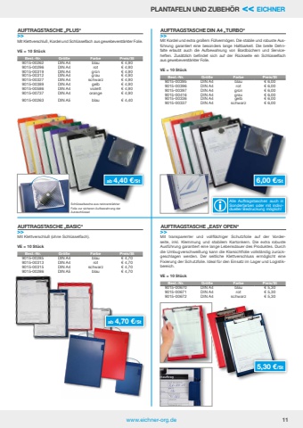www.eichner-org.de 11Mit Klettverschlu%u00df, Kordel und Schl%u00fcsselfach aus gewebeverst%u00e4rkter Folie.VE = 10 St%u00fcckSchl%u00fcsseltasche aus netzverst%u00e4rkter Folie zur sicheren Aufbewahrung der Autoschl%u00fcsselAUFTRAGSTASCHE %u201ePLUS%u201c>>ab 4,40 %u20ac/St Best.-Nr. Gr%u00f6%u00dfe Farbe Preis/St9015-00262 DIN A4 blau %u20ac 4,909015-00296 DIN A4 rot %u20ac 4,909015-00319 DIN A4 gr%u00fcn %u20ac 4,909015-00312 DIN A4 grau %u20ac 4,909015-00327 DIN A4 schwarz %u20ac 4,909015-00389 DIN A4 gelb %u20ac 4,909015-00586 DIN A4 violett %u20ac 4,909015-00737 DIN A4 orange %u20ac 4,909015-00263 DIN A5 blau %u20ac 4,40Mit Kordel und extra gro%u00dfem F%u00fcllverm%u00f6gen. Die stabile und robuste Ausf%u00fchrung garantiert eine besonders lange Haltbarkeit. Die breite Dehnfalte erlaubt auch die Aufbewahrung von Bordb%u00fcchern und Serviceheften. Zus%u00e4tzlich befindet sich auf der R%u00fcckseite ein Schl%u00fcsselfach aus gewebeverst%u00e4rkter Folie.VE = 10 St%u00fcckAUFTRAGSTASCHE DIN A4 %u201eTURBO%u201c>>Best.-Nr. Gr%u00f6%u00dfe Farbe Preis/St9015-00395 DIN A4 blau %u20ac 6,009015-00396 DIN A4 rot %u20ac 6,009015-00397 DIN A4 gr%u00fcn %u20ac 6,009015-00416 DIN A4 grau %u20ac 6,009015-00336 DIN A4 gelb %u20ac 6,009015-00337 DIN A4 schwarz %u20ac 6,00Alle Auftragstaschen auch in Sonderfarben oder mit individueller Bedruckung m%u00f6glich!6,00 %u20ac/St Mit Klettverschlu%u00df (ohne Schl%u00fcsselfach).VE = 10 St%u00fcckAUFTRAGSTASCHE %u201eBASIC%u201c>>Best.-Nr. Gr%u00f6%u00dfe Farbe Preis/St9015-00285 DIN A4 blau %u20ac 4,709015-00313 DIN A4 rot %u20ac 4,709015-00315 DIN A4 schwarz %u20ac 4,709015-00286 DIN A5 blau %u20ac 4,70ab 4,70 %u20ac/St 5,30 %u20ac/St Mit transparenter und vollfl%u00e4chiger Schutzfolie auf der Vorderseite, inkl. Klemmung und stabilem Kartonkern. Die extra robuste Ausf%u00fchrung garantiert eine lange Lebensdauer des Produktes. Durch die Umbugverschwei%u00dfung kann die Klarsichtfolie vollst%u00e4ndig zur%u00fcckgeschlagen werden. Der seitliche Klettverschluss erm%u00f6glicht eine Fixierung der Schutzfolie. Ideal f%u00fcr den Einsatz im Lager und Logistikbereich. VE = 10 St%u00fcckAUFTRAGSTASCHE %u201eEASY OPEN%u201c>>Best.-Nr. Gr%u00f6%u00dfe Farbe Preis/St9015-00670 DIN A4 blau %u20ac 5,309015-00671 DIN A4 rot %u20ac 5,309015-00672 DIN A4 schwarz %u20ac 5,30PLANTAFELN UND ZUBEH%u00d6R << EICHNER