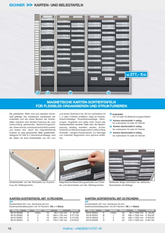 16 Hotline: +49(0)9561/2707-42MAGNETISCHE KARTEN-SORTIERTAFELNF%u00dcR FLEXIBLES ORGANISIEREN UND STRUKTURIERENEICHNER >> KARTEN- UND BELEGTAFELNDie praktischen Tafeln sind aus robustem Kunststoff gefertigt. Die metallische Vorderseite der Indextafel und der obere Bereich der Sortiertafeln erlauben eine flexible Fixierung der zum Lieferumfang geh%u00f6renden Bezeichnungsschilder. Diese k%u00f6nnen individuell beschriftet werden und lassen sich durch die magnethaftende Funktion an jede gew%u00fcnschte Stelle positionieren. Geeignet f%u00fcr DIN A 4 Hochformat-Belege, sind die Tafeln mit einer Einstecktiefe von 257 mm und einem Sichtrand von 40 mm wahlweise mit 1, 2 oder 3 Reihen erh%u00e4ltlich. Ideal f%u00fcr Arbeitsfortschrittbelege, Produktionsauftr%u00e4ge, Rechnungen, Angebote und vieles mehr. Durch das Aneinanderreihen einzelner Tafeln kann die Gesamtplanung beliebig erweitert werden. Einzelschienen zur Wandmontage sind im Lieferumfang enthalten. L%u00e4ngere Profilschienen zur Montage von mehreren Segmenten sind optional erh%u00e4ltlich. A B C Dab 277,- %u20ac/St Abstandhalter auf der R%u00fcckseite zur Ausrichtung der Tafelsegmente.Magnetische Beschriftungsschilder zum Fixieren und Verschieben auf den Tafelsegmenten.Verdeckte Stege verhindern ein seitliches Verschieben der Belege.A Indextafelmit 10 oder 25 BezeichnungsschildernB Karten-Sortiertafel 1-reihigf%u00fcr wahlweise 10 oder 25 F%u00e4cherC Karten-Sortiertafel 2-reihigf%u00fcr wahlweise 10 oder 25 F%u00e4cherD Karten-Sortiertafel 3-reihigf%u00fcr wahlweise 10 oder 25 F%u00e4cherBest.-Nr. Abb. Spalten F%u00e4cher Ma%u00dfe Preis/St9219-02006 A Index 10 80 x 750 mm %u20ac 67,009219-02000 B 1 10 260 x 750 mm %u20ac 277,009219-02002 C 2 10 490 x 750 mm %u20ac 412,009219-02004 D 3 10 720 x 750 mm %u20ac 619,00Einstecktiefe 257 mm, Sichtrand 40 mmKartensortiertafelsystem mit 10 F%u00e4chern, VE = 1 St%u00fcckKARTEN-SORTIERTAFEL MIT 10 F%u00c4CHERN>>Best.-Nr. Abb. Spalten F%u00e4cher Ma%u00dfe Preis/St9219-02007 A Index 25 80 x 1350 mm %u20ac 94,009219-02001 B 1 25 260 x 1350 mm %u20ac 423,009219-02003 C 2 25 490 x 1350 mm %u20ac 619,009219-02005 D 3 25 720 x 1350 mm %u20ac 921,00Einstecktiefe 257 mm, Sichtrand 40 mmKartensortiertafelsystem mit 25 F%u00e4chern, VE = 1 St%u00fcckKARTEN-SORTIERTAFEL MIT 25 F%u00c4CHERN>>