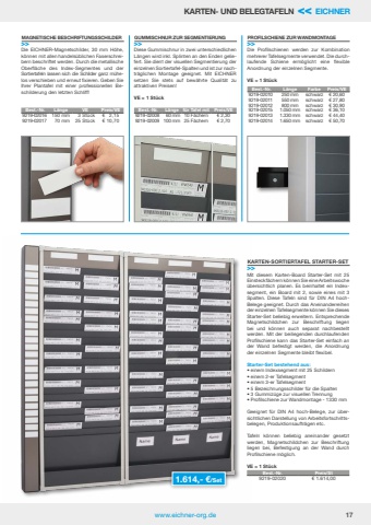 www.eichner-org.de 17KARTEN- UND BELEGTAFELN << EICHNER1.614,- %u20ac/Set Best.-Nr. Preis/St9219-02020 %u20ac 1.614,00Mit diesem Karten-Board Starter-Set mit 25 Einsteckf%u00e4chern k%u00f6nnen Sie eine Arbeitswoche %u00fcbersichtlich planen. Es beinhaltet ein Indexsegment, ein Board mit 2, sowie eines mit 3 Spalten. Diese Tafeln sind f%u00fcr DIN A4 hochBelege geeignet. Durch das Aneinanderreihen der einzelnen Tafelsegmente k%u00f6nnen Sie dieses Starter-Set beliebig erweitern. Entsprechende Magnetschildchen zur Beschriftung liegen bei und k%u00f6nnen auch separat nachbestellt werden. Mit der beiliegenden durchlaufenden Profilschiene kann das Starter-Set einfach an der Wand befestigt werden, die Anordnung der einzelnen Segmente bleibt flexibel.Starter-Set bestehend aus:%u2022 einem Indexsegment mit 25 Schildern%u2022 einem 2-er Tafelsegment%u2022 einem 3-er Tafelsegment%u2022 5 Bezeichnungsschilder f%u00fcr die Spalten%u2022 3 Gummiz%u00fcge zur visuellen Trennung%u2022 Profilschiene zur Wandmontage - 1330 mmGeeignet f%u00fcr DIN A4 hoch-Belege, zur %u00fcbersichtlichen Darstellung von Arbeitsfortschrittsbelegen, Produktionsauftr%u00e4gen etc.Tafeln k%u00f6nnen beliebig aneinander gesetzt werden, Magnetschildchen zur Beschriftung liegen bei, Befestigung an der Wand durch Profilschiene m%u00f6glich.VE = 1 St%u00fcckKARTEN-SORTIERTAFEL STARTER-SET>>Best.-Nr. L%u00e4nge VE Preis/VE9219-02016 150 mm 3 St%u00fcck %u20ac 2,159219-02017 70 mm 25 St%u00fcck %u20ac 10,70Best.-Nr. L%u00e4nge f%u00fcr Tafel mit Preis/VE9219-02008 60 mm 10 F%u00e4chern %u20ac 2,309219-02009 100 mm 25 F%u00e4chern %u20ac 2,70Best.-Nr. L%u00e4nge Farbe Preis/VE9219-02010 250 mm schwarz %u20ac 20,609219-02011 550 mm schwarz %u20ac 27,809219-02012 800 mm schwarz %u20ac 30,909219-02015 1.050 mm schwarz %u20ac 36,109219-02013 1.330 mm schwarz %u20ac 44,409219-02014 1.650 mm schwarz %u20ac 50,70Die EICHNER-Magnetschilder, 30 mm H%u00f6he, k%u00f6nnen mit allen handels%u00fcblichen Faserschreibern beschriftet werden. Durch die metallische Oberfl%u00e4che des Index-Segmentes und der Sortiertafeln lassen sich die Schilder ganz m%u00fchelos verschieben und erneut fixieren. Geben Sie Ihrer Plantafel mit einer professionellen Beschilderung den letzten Schliff!Diese Gummischnur in zwei unterschiedlichen L%u00e4ngen wird inkl. Splinten an den Enden geliefert. Sie dient der visuellen Segmentierung der einzelnen Sortiertafel-Spalten und ist zur nachtr%u00e4glichen Montage geeignet. Mit EICHNER setzen Sie stets auf bew%u00e4hrte Qualit%u00e4t zu attraktiven Preisen!VE = 1 St%u00fcckDie Profilschienen werden zur Kombination mehrerer Tafelsegmente verwendet. Die durchlaufende Schiene erm%u00f6glicht eine flexible Anordnung der einzelnen Segmente.VE = 1 St%u00fcckMAGNETISCHE BESCHRIFTUNGSSCHILDER>>GUMMISCHNUR ZUR SEGMENTIERUNG>>PROFILSCHIENE ZUR WANDMONTAGE>>