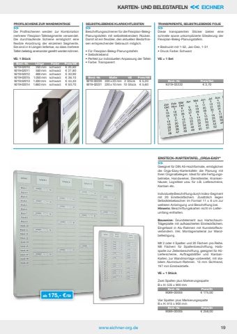 www.eichner-org.de 19Geeignet f%u00fcr DIN A5-Hochformate, erm%u00f6glichen die Orga-Easy-Kartentafeln die Planung mit Ihren Originalbelegen. Ideal f%u00fcr alle Fertigungsbetriebe, Handwerker, Dienstleister, Krankenh%u00e4user, Logistiker usw. f%u00fcr z.B. Lieferscheine, Kanban etc.Individuelle Beschriftung durch Index-Segment mit 20 Einsteckf%u00e4chern. Zus%u00e4tzlich liegen Selbstklebetaschen im Format 11 x 6 cm zur weiteren Anbringung und Beschriftung bei.Hinweis: Beschriftungskarten nicht im Lieferumfang enthalten.Bauweise: Grundelement aus HartschaumTr%u00e4gerplatte mit aufkaschierten Einsteckf%u00e4chern. Eingefasst in Alu-Rahmen mit Kunststoffeckverbindern. Inkl. Montagematerial zur Wandbefestigung.Mit 2 oder 4 Spalten und 20 F%u00e4chern pro Reihe. Mit F%u00e4chern f%u00fcr Spaltenbeschriftung, Halbspalte zur Zeilenbeschriftung, geeignet f%u00fcr A5-Lieferscheine, Auftragsbl%u00e4tter und KanbanKarten, zur Wandmontage vorbereitet, mit stabilem Aluminium-Rahmen. 13 mm Sichtrand, 197 mm Einstecktiefe.VE = 1 St%u00fcckZwei Spalten plus MarkierungsspalteB x H: 535 x 900 mmVier Spalten plus MarkierungsspalteB x H: 915 x 900 mmab 175,- %u20ac/St Best.-Nr. L%u00e4nge Farbe Preis/VE9219-02010 250 mm schwarz %u20ac 20,609219-02011 550 mm schwarz %u20ac 27,809219-02012 800 mm schwarz %u20ac 30,909219-02015 1.050 mm schwarz %u20ac 36,109219-02013 1.330 mm schwarz %u20ac 44,409219-02014 1.650 mm schwarz %u20ac 50,70Best.-Nr. Ma%u00dfe VE Preis/VE9219-02220 220 x 23 mm 2 St%u00fcck %u20ac 5,209219-02221 220 x 10 mm 10 St%u00fcck %u20ac 5,60Best.-Nr. Preis/Set9219-02222 %u20ac 3,70Die Profilschienen werden zur Kombination mehrerer Flexiplan-Tafelsegmente verwendet. Die durchlaufende Schiene erm%u00f6glicht eine flexible Anordnung der einzelnen Segmente. Sie sind in 6 L%u00e4ngen lieferbar, so dass mehrere Tafeln beliebig aneinander gereiht werden k%u00f6nnen. VE: 1 St%u00fcckBeschriftungsschienen f%u00fcr die Flexiplan-BelegPlanungstafeln mit selbstklebendem R%u00fccken. Damit ist ein flexibler, den aktuellen Bed%u00fcrfnissen entsprechender Gebrauch m%u00f6glich.%u2022 F%u00fcr Flexiplan-Beleg-Planungstafeln%u2022 Selbstklebend%u2022 Perfekt zur individuellen Anpassung der Tafeln%u2022 Farbe: TransparentDiese transparenten Sticker bieten eine schnelle sowie unkomplizierte Gliederung der Flexiplan-Beleg-Planungstafeln.%u2022 Bedruckt mit 1-52, Jan-Dez, 1-31%u2022 Druck Farbe: SchwarzVE = 1 SetPROFILSCHIENE ZUR WANDMONTAGE>>SELBSTKLEBENDE KLARSICHTLEISTEN>>TRANSPARENTE, SELBSTKLEBENDE FOLIE>>Best.-Nr. Preis/St9089-00004 %u20ac 175,00Best.-Nr. Preis/St9089-00005 %u20ac 258,00EINSTECK-/KARTENTAFEL %u201eORGA-EASY%u201c>>KARTEN- UND BELEGTAFELN << EICHNER