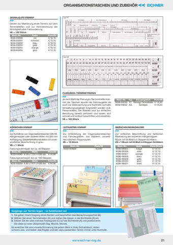 Typ ASTyp PTwww.eichner-org.de 21K%u00d6RBCHEN VISIMAP >>LEITKARTEN VISIMAP >>PLANUNGS-/TERMINSTREIFEN>>BEZEICHNUNGSSCHILDER>>SIGNALCLIPS VISIMAP>>Zur Aufnahme von Organisationstaschen DIN A4, H%u00e4ngemappen oder anderen Akten mit 330 mm Aufh%u00e4ngung. Stabile Metallkonstruktion mit unverw%u00fcstlicher Beschichtung in grau. VE = 1 St%u00fcckZur Unterteilung der Organisationstaschen und Fahrzeugakten, aus stabilem, umweltfreundlichem Polypropylen.VE = 10 St%u00fcckJe nach Wahl der Planungs-/Terminstreifen k%u00f6nnen die Taschen sowohl als Fahrzeugakte als auch zur %u00dcberwachung und Kontrolle normaler Verwaltungsvorg%u00e4nge eingesetzt werden (z.B. Personalakte). Die Streifen sind zur einfachen Benutzung bereits perforiert und lassen sich schnell und einfach beschriften und einsetzen.VE = 100 St%u00fcckZur einfachen Beschriftung und farblichen Markierung der einzelnen H%u00e4ngemappen.Block mit 50 Blatt %u00e0 5 Doppel-Schildern.VE = 1 Block mit 50 Blatt %u00e0 5 Doppel-SchildernDienen zur Markierung eines Termins auf dem Terminstreifen und zur Kennzeichnung der Wichtigkeit %u00fcber Farbcodierung.VE = 100 St%u00fcckBest.-Nr. Preis/St9035-00056 %u20ac 3,80Best.-Nr. Farbe Preis/St9035-00200 rot %u20ac 13,109035-00201 schwarz %u20ac 13,109035-00202 blau %u20ac 13,109035-00203 gelb %u20ac 13,109035-00204 orange %u20ac 13,109030-00205 gr%u00fcn %u20ac 13,10Best.-Nr. Ma%u00dfe Preis/St9030-00082 B 335 x T 335 x H 262 mm %u20ac 45,80Best.-Nr. Ma%u00dfe Preis/Block9036-00025 beige %u20ac 12,109036-00026 rosa %u20ac 12,109036-00027 orange %u20ac 12,109036-00028 blau %u20ac 12,109036-00029 gelb %u20ac 12,109036-00030 gr%u00fcn %u20ac 12,109036-00031 wei%u00df %u20ac 12,10Best.-Nr. Typ Einsatzgebiet Preis/VE9036-00040 PT Planungs-/Terminstreifen %u20ac 19,309036-00052 AS Sonstiges %u20ac 19,30Best.-Nr. Ma%u00dfe Preis/St9030-00058 B 361 x T 671 x H 262 mm %u20ac 91,90Fassungsverm%u00f6gen bis ca. 40 MappenFassungsverm%u00f6gen bis ca. 100 MappenVorg%u00e4nge auf Termin legen %u2013 so funktioniert es!1. Sie geben Ihrem Vorgang einen Namen und beschriften das Bezeichnungsschild (B). 2. W%u00e4hlen Sie einen Terminstreifen (D) und ziehen Sie diesen in die Sichtleiste (A) ein.3. Setzen Sie ein oder mehrere Farbsignale (C) auf die Sichtleiste (A) und positionieren Sie diese an einer Zeitperiode (Tag, Woche, Monat). So erreichen Sie eine visuelle Erinnerung bei jedem Blick in Ihren Schreibtisch, Aktenschrank usw. und haben das Projekt und den dazu passenden Termin immer unter Kontrolle.ORGANISATIONSTASCHEN UND ZUBEH%u00d6R << EICHNER