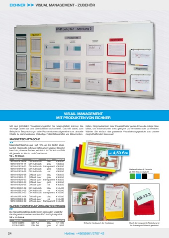 24 Hotline: +49(0)9561/2707-42VISUAL MANAGEMENT MIT PRODUKTEN VON EICHNEREICHNER >> VISUAL MANAGEMENT - ZUBEH%u00d6REinfacher Austausch der Aush%u00e4ngeab 4,50 %u20ac/St MAGNETSICHTTASCHE>>Magnetsichttaschen aus Hart-PVC, an drei Seiten abgekantet, R%u00fcckseite mit zwei haftstarken Magnet-Streifen best%u00fcckt, diverse Farben, erh%u00e4ltlich in DIN A4 und DIN A6, jeweils im Hoch- und Querformat.VE = 10 St%u00fcckBest.-Nr. Format Farbe Preis/VE9218-01819-08 DIN A4 hoch blau %u20ac 63,509218-01819-11 DIN A4 hoch grau %u20ac 63,509218-01819-00 DIN A4 hoch transparent %u20ac 63,509218-01819-03 DIN A4 hoch gelb %u20ac 63,509218-01819-05 DIN A4 hoch rot %u20ac 63,509218-01820-08 DIN A4 quer blau %u20ac 63,509218-01820-11 DIN A4 quer grau %u20ac 63,509218-01820-00 DIN A4 quer transparent %u20ac 63,509218-01820-03 DIN A4 quer gelb %u20ac 63,509218-01820-05 DIN A4 quer rot %u20ac 63,509218-02952-08 DIN A6 hoch blau %u20ac 45,009218-02952-05 DIN A6 hoch rot %u20ac 45,009218-02952-00 DIN A6 hoch transparent %u20ac 45,009218-02953-08 DIN A6 quer blau %u20ac 45,009218-02953-05 DIN A6 quer rot %u20ac 45,009218-02953-00 DIN A6 quer transparent %u20ac 45,00KLARSICHTERSATZFOLIE F%u00dcR MAGNETSICHTTASCHE>>Die Klarsichtersatzfolie bietet einen passenden Ersatz f%u00fcr die Magnetsichttaschen aus Hart-PVC in Originalqualit%u00e4t. VE = 10 St%u00fcckBest.-Nr. Format Farbe Preis/VE9218-03819 DIN A4 blau %u20ac 11,809218-03820 DIN A6 grau %u20ac 5,02Mit den EICHNER Visualisierungshilfen f%u00fcr Magnettafeln k%u00f6nnen Sie wichtige Daten klar und %u00fcbersichtlich strukturieren. Das hilft dabei, zum Beispiel in Besprechungs- oder Pausenr%u00e4umen allgemeine bzw. aktuelle Inhalte zu kommunizieren. Vielseitige Pr%u00e4sentationsmittel wie Dokumentenh%u00fcllen, Ringmechaniken oder Prospekthalter geben Ihnen die n%u00f6tige Flexibilit%u00e4t, um Informationen stets geeignet zu vermitteln oder zu erheben. W%u00e4hlen Sie einfach das passende Visualisierungsprodukt aus unserer magnethaftenden Serie aus!Durch die transparente Abdeckung ist Ihr Aushang vor Schmutz gesch%u00fctztWeitere Farben & Formate ab 150 St%u00fcck m%u00f6glich!