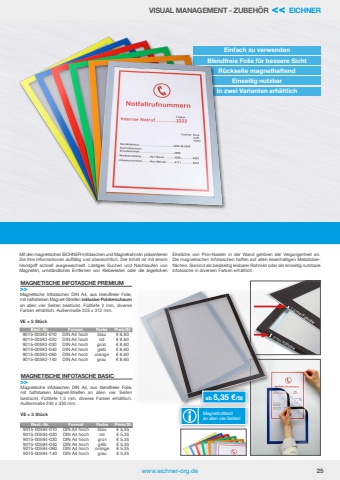 www.eichner-org.de 25MAGNETISCHE INFOTASCHE PREMIUM>>Magnetische Infotaschen DIN A4, aus blendfreier Folie, mit haftstarken Magnet-Streifen inklusive Polsterschaum an allen vier Seiten best%u00fcckt, F%u00fclltiefe 3 mm, diverse Farben erh%u00e4ltlich. Au%u00dfenma%u00dfe 225 x 312 mm. VE = 5 St%u00fcckBest.-Nr. Format Farbe Preis/St9015-00593-010 DIN A4 hoch blau %u20ac 8,609015-00593-020 DIN A4 hoch rot %u20ac 8,609015-00593-030 DIN A4 hoch gr%u00fcn %u20ac 8,609015-00593-040 DIN A4 hoch gelb %u20ac 8,609015-00593-060 DIN A4 hoch orange %u20ac 8,609015-00593-140 DIN A4 hoch grau %u20ac 8,60MAGNETISCHE INFOTASCHE BASIC>>Magnetische Infotaschen DIN A4, aus blendfreier Folie, mit haftstarken Magnet-Streifen an allen vier Seiten best%u00fcckt, F%u00fclltiefe 1,5 mm, diverse Farben erh%u00e4ltlich. Au%u00dfenma%u00dfe 240 x 330 mm.VE = 5 St%u00fcckBest.-Nr. Format Farbe Preis/St9015-00594-010 DIN A4 hoch blau %u20ac 5,359015-00594-020 DIN A4 hoch rot %u20ac 5,359015-00594-030 DIN A4 hoch gr%u00fcn %u20ac 5,359015-00594-040 DIN A4 hoch gelb %u20ac 5,359015-00594-060 DIN A4 hoch orange %u20ac 5,359015-00594-140 DIN A4 hoch grau %u20ac 5,35Einfach zu verwendenBlendfreie Folie f%u00fcr bessere SichtR%u00fcckseite magnethaftendEinseitig nutzbarIn zwei Varianten erh%u00e4ltlichVISUAL MANAGEMENT - ZUBEH%u00d6R << EICHNERMit den magnetischen EICHNER-Infotaschen und Magnetrahmen pr%u00e4sentierenSie Ihre Informationen auff%u00e4llig und %u00fcbersichtlich. Der Inhalt ist mit einemHandgriff schnell ausgewechselt. L%u00e4stiges Suchen und Nachkaufen von Magneten, umst%u00e4ndliches Entfernen von Kleberesten oder die %u00e4rgerlichen Einstiche von Pinn-Nadeln in der Wand geh%u00f6ren der Vergangenheit an. Die magnetischen Infotaschen haften auf allen eisenhaltigen Metalloberfl%u00e4chen. Sie sind als beidseitig lesbarer Rahmen oder als einseitig nutzbare Infotasche in diversen Farben erh%u00e4ltlich.ab 5,35 %u20ac/St Magnethaftend an allen vier Seiten!1,5 mm F%u00fcllh%u00f6he3 mm F%u00fcllh%u00f6he