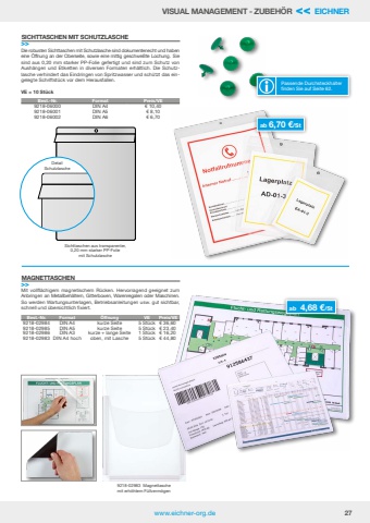 www.eichner-org.de 27VISUAL MANAGEMENT - ZUBEH%u00d6R << EICHNERBest.-Nr. Format %u00d6ffnung VE Preis/VE9218-02984 DIN A4 kurze Seite 5 St%u00fcck %u20ac 36,609218-02985 DIN A5 kurze Seite 5 St%u00fcck %u20ac 23,409218-02986 DIN A3 kurze + lange Seite 1 St%u00fcck %u20ac 16,209218-02983 DIN A4 hoch oben, mit Lasche 5 St%u00fcck %u20ac 44,80Mit vollfl%u00e4chigem magnetischem R%u00fccken. Hervorragend geeignet zum Anbringen an Metallbeh%u00e4ltern, Gitterboxen, Warenregalen oder Maschinen. So werden Wartungsunterlagen, Betriebsanleitungen usw. gut sichtbar, schnell und %u00fcbersichtlich fixiert.MAGNETTASCHEN>>ab 4,68 %u20ac/St Best.-Nr. Format Preis/VE9218-06000 DIN A4 %u20ac 10,409218-06001 DIN A5 %u20ac 8,109218-06002 DIN A6 %u20ac 6,70Die robusten Sichttaschen mit Schutzlasche sind dokumentenecht und haben eine %u00d6ffnung an der Oberseite, sowie eine mittig geschwei%u00dfte Lochung. Sie sind aus 0,20 mm starker PP-Folie gefertigt und sind zum Schutz von Aush%u00e4ngen und Etiketten in diversen Formaten erh%u00e4ltlich. Die Schutzlasche verhindert das Eindringen von Spritzwasser und sch%u00fctzt das eingelegte Schriftst%u00fcck vor dem Herausfallen.VE = 10 St%u00fcckSICHTTASCHEN MIT SCHUTZLASCHE>>Sichttaschen aus transparenter, 0,20 mm starker PP-Foliemit SchutzlascheDetail Schutzlascheab 6,70 %u20ac/St 9218-02983 Magnettasche mit erh%u00f6htem F%u00fcllverm%u00f6genPassende Durchsteckhalter finden Sie auf Seite 62.