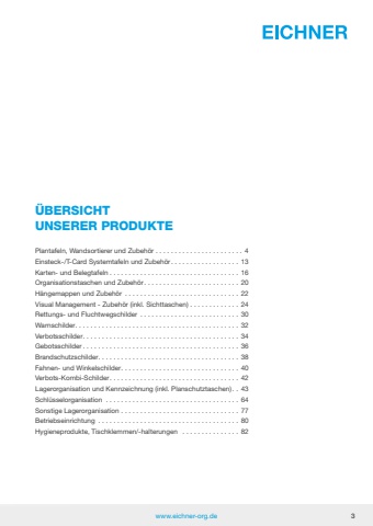 www.eichner-org.de 3Plantafeln, Wandsortierer und Zubeh%u00f6r . . . . . . . . . . . . . . . . . . . . . . . 4 Einsteck-/T-Card Systemtafeln und Zubeh%u00f6r . . . . . . . . . . . . . . . . . . 13Karten- und Belegtafeln . . . . . . . . . . . . . . . . . . . . . . . . . . . . . . . . . . 16Organisationstaschen und Zubeh%u00f6r . . . . . . . . . . . . . . . . . . . . . . . . . 20H%u00e4ngemappen und Zubeh%u00f6r . . . . . . . . . . . . . . . . . . . . . . . . . . . . . . . 22Visual Management - Zubeh%u00f6r (inkl. Sichttaschen) . . . . . . . . . . . . . . 24Rettungs- und Fluchtwegschilder . . . . . . . . . . . . . . . . . . . . . . . . . . . 30Warnschilder . . . . . . . . . . . . . . . . . . . . . . . . . . . . . . . . . . . . . . . . . . . 32Verbotsschilder . . . . . . . . . . . . . . . . . . . . . . . . . . . . . . . . . . . . . . . . . 34Gebotsschilder . . . . . . . . . . . . . . . . . . . . . . . . . . . . . . . . . . . . . . . . . 36Brandschutzschilder . . . . . . . . . . . . . . . . . . . . . . . . . . . . . . . . . . . . . 38Fahnen- und Winkelschilder . . . . . . . . . . . . . . . . . . . . . . . . . . . . . . . 40Verbots-Kombi-Schilder . . . . . . . . . . . . . . . . . . . . . . . . . . . . . . . . . . 42Lagerorganisation und Kennzeichnung (inkl. Planschutztaschen) . . 43Schl%u00fcsselorganisation . . . . . . . . . . . . . . . . . . . . . . . . . . . . . . . . . . . . 64Sonstige Lagerorganisation . . . . . . . . . . . . . . . . . . . . . . . . . . . . . . . . 77Betriebseinrichtung . . . . . . . . . . . . . . . . . . . . . . . . . . . . . . . . . . . . . . 80Hygieneprodukte, Tischklemmen/-halterungen . . . . . . . . . . . . . . . . 82%u00dcBERSICHTUNSERER PRODUKTE