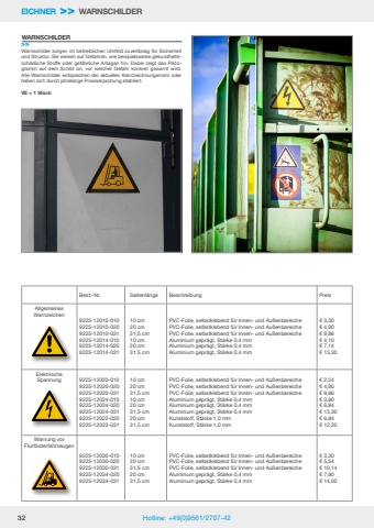 32 Hotline: +49(0)9561/2707-42EICHNER >> WARNSCHILDERBest.-Nr. Seitenl%u00e4nge Beschreibung PreisAllgemeines Warnzeichen9225-12010-0109225-12010-0209225-12010-0319225-12014-0109225-12014-0209225-12014-03110 cm20 cm31,5 cm10 cm20 cm31,5 cmPVC-Folie, selbstklebend f%u00fcr Innen- und Au%u00dfenbereichePVC-Folie, selbstklebend f%u00fcr Innen- und Au%u00dfenbereichePVC-Folie, selbstklebend f%u00fcr Innen- und Au%u00dfenbereicheAluminium gepr%u00e4gt, St%u00e4rke 0,4 mmAluminium gepr%u00e4gt, St%u00e4rke 0,4 mmAluminium gepr%u00e4gt, St%u00e4rke 0,4 mm%u20ac 3,30%u20ac 4,90%u20ac 9,86%u20ac 4,10%u20ac 7,14%u20ac 13,30Elektrische Spannung 9225-12020-0109225-12020-0209225-12020-0319225-12024-0109225-12024-0209225-12024-0319225-12022-0209225-12022-03110 cm20 cm31,5 cm10 cm20 cm31,5 cm20 cm31,5 cmPVC-Folie, selbstklebend f%u00fcr Innen- und Au%u00dfenbereichePVC-Folie, selbstklebend f%u00fcr Innen- und Au%u00dfenbereichePVC-Folie, selbstklebend f%u00fcr Innen- und Au%u00dfenbereicheAluminium gepr%u00e4gt, St%u00e4rke 0,4 mmAluminium gepr%u00e4gt, St%u00e4rke 0,4 mmAluminium gepr%u00e4gt, St%u00e4rke 0,4 mmKunststoff, St%u00e4rke 1,0 mmKunststoff, St%u00e4rke 1,0 mm%u20ac 2,24%u20ac 4,90%u20ac 9,86%u20ac 3,80%u20ac 6,84%u20ac 13,30%u20ac 6,84%u20ac 12,20Warnung vorFlurf%u00f6rderfahrzeugen9225-12030-0109225-12030-0209225-12030-0319225-12034-0209225-12034-03110 cm20 cm31,5 cm20 cm31,5 cmPVC-Folie, selbstklebend f%u00fcr Innen- und Au%u00dfenbereichePVC-Folie, selbstklebend f%u00fcr Innen- und Au%u00dfenbereichePVC-Folie, selbstklebend f%u00fcr Innen- und Au%u00dfenbereicheAluminium gepr%u00e4gt, St%u00e4rke 0,4 mmAluminium gepr%u00e4gt, St%u00e4rke 0,4 mm%u20ac 3,30%u20ac 5,54%u20ac 10,14%u20ac 7,90%u20ac 14,00Warnschilder sorgen im betrieblichen Umfeld zuverl%u00e4ssig f%u00fcr Sicherheit und Struktur. Sie weisen auf Gefahren, wie beispielsweise gesundheitssch%u00e4dliche Stoffe oder gef%u00e4hrliche Anlagen hin. Dabei zeigt das Piktogramm auf dem Schild an, vor welcher Gefahr konkret gewarnt wird. Alle Warnschilder entsprechen der aktuellen Kennzeichnungsnorm oder haben sich durch jahrelange Praxiserprobung etabliert. VE = 1 St%u00fcckWARNSCHILDER>>