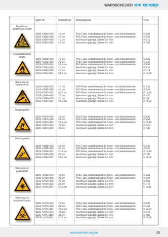 www.eichner-org.de 33WARNSCHILDER << EICHNERBest.-Nr. Seitenl%u00e4nge Beschreibung PreisExplosionsgef%u00e4hrliche Stoffe9225-12040-0109225-12040-0209225-12044-0109225-12044-02010 cm20 cm10 cm20 cmPVC-Folie, selbstklebend f%u00fcr Innen- und Au%u00dfenbereichePVC-Folie, selbstklebend f%u00fcr Innen- und Au%u00dfenbereicheAluminium gepr%u00e4gt, St%u00e4rke 0,4 mmAluminium gepr%u00e4gt, St%u00e4rke 0,4 mm%u20ac 3,30%u20ac 5,54%u20ac 4,10%u20ac 7,90Feuergef%u00e4hrliche Stoffe9225-12050-0109225-12050-0209225-12050-0319225-12054-0109225-12054-0209225-12054-03110 cm20 cm31,5 cm10 cm20 cm31,5 cmPVC-Folie, selbstklebend f%u00fcr Innen- und Au%u00dfenbereichePVC-Folie, selbstklebend f%u00fcr Innen- und Au%u00dfenbereichePVC-Folie, selbstklebend f%u00fcr Innen- und Au%u00dfenbereicheAluminium gepr%u00e4gt, St%u00e4rke 0,4 mmAluminium gepr%u00e4gt, St%u00e4rke 0,4 mmAluminium gepr%u00e4gt, St%u00e4rke 0,4 mm%u20ac 3,30%u20ac 4,90%u20ac 9,86%u20ac 4,10%u20ac 7,14%u20ac 13,30Warnung vor Gasflaschen9225-12060-0109225-12060-0209225-12060-0319225-12064-0109225-12064-0209225-12064-03110 cm20 cm31,5 cm10 cm20 cm31,5 cmPVC-Folie, selbstklebend f%u00fcr Innen- und Au%u00dfenbereichePVC-Folie, selbstklebend f%u00fcr Innen- und Au%u00dfenbereichePVC-Folie, selbstklebend f%u00fcr Innen- und Au%u00dfenbereicheAluminium gepr%u00e4gt, St%u00e4rke 0,4 mmAluminium gepr%u00e4gt, St%u00e4rke 0,4 mmAluminium gepr%u00e4gt, St%u00e4rke 0,4 mm%u20ac 3,30%u20ac 5,54%u20ac 11,10%u20ac 4,30%u20ac 7,90%u20ac 14,00Stolpergefahr9225-12070-0109225-12070-0209225-12070-0319225-12074-0109225-12074-02010 cm20 cm31,5 cm10 cm20 cmPVC-Folie, selbstklebend f%u00fcr Innen- und Au%u00dfenbereichePVC-Folie, selbstklebend f%u00fcr Innen- und Au%u00dfenbereichePVC-Folie, selbstklebend f%u00fcr Innen- und Au%u00dfenbereicheAluminium gepr%u00e4gt, St%u00e4rke 0,4 mmAluminium gepr%u00e4gt, St%u00e4rke 0,4 mm%u20ac 3,30%u20ac 5,54%u20ac 11,10%u20ac 4,10%u20ac 7,90 Rutschgefahr9225-12080-0109225-12080-0209225-12080-0319225-12084-0209225-12084-03110 cm20 cm31,5 cm20 cm31,5 cmPVC-Folie, selbstklebend f%u00fcr Innen- und Au%u00dfenbereichePVC-Folie, selbstklebend f%u00fcr Innen- und Au%u00dfenbereichePVC-Folie, selbstklebend f%u00fcr Innen- und Au%u00dfenbereicheAluminium gepr%u00e4gt, St%u00e4rke 0,4 mmAluminium gepr%u00e4gt, St%u00e4rke 0,4 mm%u20ac 3,30%u20ac 5,54%u20ac 11,10%u20ac 7,90%u20ac 14,00Warnung vor Laserstrahl9225-12100-0109225-12100-0209225-12104-0109225-12104-0209225-12104-03110 cm20 cm10 cm20 cm31,5 cmPVC-Folie, selbstklebend f%u00fcr Innen- und Au%u00dfenbereichePVC-Folie, selbstklebend f%u00fcr Innen- und Au%u00dfenbereicheAluminium gepr%u00e4gt, St%u00e4rke 0,4 mmAluminium gepr%u00e4gt, St%u00e4rke 0,4 mmAluminium gepr%u00e4gt, St%u00e4rke 0,4 mm%u20ac 3,28%u20ac 4,90%u20ac 4,00%u20ac 7,14%u20ac 13,30Warnung vor t%u00f6dlicher Gefahr9225-12110-0109225-12110-0209225-12110-0319225-12114-0109225-12114-0209225-12114-03110 cm20 cm31,5 cm10 cm20 cm31,5 cmPVC-Folie, selbstklebend f%u00fcr Innen- und Au%u00dfenbereichePVC-Folie, selbstklebend f%u00fcr Innen- und Au%u00dfenbereichePVC-Folie, selbstklebend f%u00fcr Innen- und Au%u00dfenbereicheAluminium gepr%u00e4gt, St%u00e4rke 0,4 mmAluminium gepr%u00e4gt, St%u00e4rke 0,4 mmAluminium gepr%u00e4gt, St%u00e4rke 0,4 mm%u20ac 3,30%u20ac 5,54%u20ac 10,14%u20ac 4,10%u20ac 7,90%u20ac 14,00
