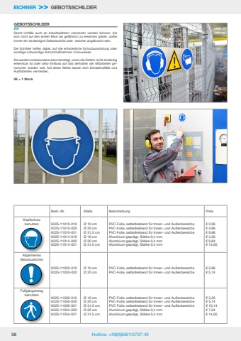 36 Hotline: +49(0)9561/2707-42EICHNER >> GEBOTSSCHILDERBest.-Nr. Ma%u00dfe Beschreibung PreisKopfschutz benutzen 9225-11010-0109225-11010-0209225-11010-0319225-11014-0109225-11014-0209225-11014-031%u00d8 10 cm%u00d8 20 cm%u00d8 31,5 cm%u00d8 10 cm%u00d8 20 cm%u00d8 31,5 cmPVC-Folie, selbstklebend f%u00fcr Innen- und Au%u00dfenbereichePVC-Folie, selbstklebend f%u00fcr Innen- und Au%u00dfenbereichePVC-Folie, selbstklebend f%u00fcr Innen- und Au%u00dfenbereicheAluminium gepr%u00e4gt, St%u00e4rke 0,4 mmAluminium gepr%u00e4gt, St%u00e4rke 0,4 mmAluminium gepr%u00e4gt, St%u00e4rke 0,4 mm%u20ac 2,06%u20ac 4,96%u20ac 9,86%u20ac 4,30%u20ac 6,84%u20ac 14,00Allgemeines Gebotszeichen9225-11020-0109225-11020-020%u00d8 10 cm%u00d8 20 cmPVC-Folie, selbstklebend f%u00fcr Innen- und Au%u00dfenbereichePVC-Folie, selbstklebend f%u00fcr Innen- und Au%u00dfenbereiche%u20ac 2,96%u20ac 5,74Fu%u00dfg%u00e4ngerwegbenutzen9225-11030-0109225-11030-0209225-11030-0319225-11034-0209225-11034-031%u00d8 10 cm%u00d8 20 cm%u00d8 31,5 cm%u00d8 20 cm%u00d8 31,5 cmPVC-Folie, selbstklebend f%u00fcr Innen- und Au%u00dfenbereichePVC-Folie, selbstklebend f%u00fcr Innen- und Au%u00dfenbereichePVC-Folie, selbstklebend f%u00fcr Innen- und Au%u00dfenbereicheAluminium gepr%u00e4gt, St%u00e4rke 0,4 mmAluminium gepr%u00e4gt, St%u00e4rke 0,4 mm%u20ac 3,30%u20ac 5,74%u20ac 10,14%u20ac 7,04%u20ac 14,00Damit Unf%u00e4lle auch an Arbeitspl%u00e4tzen vermieden werden k%u00f6nnen, die sich nicht auf den ersten Blick als gef%u00e4hrlich zu erkennen geben, sollte immer ein eindeutiges Gebotsschild oder -zeichen angebracht sein. Die Schilder helfen dabei, auf die erforderliche Schutzausr%u00fcstung oder sonstige notwendige Schutzma%u00dfnahmen hinzuweisen. Sie werden insbesondere dann ben%u00f6tigt, wenn die Gefahr nicht eindeutig erkennbar ist oder aktiv Einfluss auf das Verhalten der Mitarbeiter genommen werden soll. Auf diese Weise lassen sich Schadensf%u00e4lle und Ausfallzeiten vermeiden.VE = 1 St%u00fcckGEBOTSSCHILDER>>