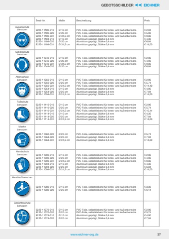 www.eichner-org.de 37GEBOTSSCHILDER << EICHNERBest.-Nr. Ma%u00dfe Beschreibung PreisAugenschutz benutzen 9225-11100-0109225-11100-0209225-11100-0319225-11104-0109225-11104-0209225-11104-031%u00d8 10 cm%u00d8 20 cm%u00d8 31,5 cm%u00d8 10 cm%u00d8 20 cm%u00d8 31,5 cmPVC-Folie, selbstklebend f%u00fcr Innen- und Au%u00dfenbereichePVC-Folie, selbstklebend f%u00fcr Innen- und Au%u00dfenbereichePVC-Folie, selbstklebend f%u00fcr Innen- und Au%u00dfenbereicheAluminium gepr%u00e4gt, St%u00e4rke 0,4 mmAluminium gepr%u00e4gt, St%u00e4rke 0,4 mmAluminium gepr%u00e4gt, St%u00e4rke 0,4 mm%u20ac 2,04%u20ac 5,03%u20ac 9,86%u20ac 4,30%u20ac 6,84%u20ac 14,00Geh%u00f6rschutz benutzen9225-11040-0109225-11040-0209225-11040-0319225-11044-020%u00d8 10 cm%u00d8 20 cm%u00d8 31,5 cm%u00d8 20 cmPVC-Folie, selbstklebend f%u00fcr Innen- und Au%u00dfenbereichePVC-Folie, selbstklebend f%u00fcr Innen- und Au%u00dfenbereichePVC-Folie, selbstklebend f%u00fcr Innen- und Au%u00dfenbereicheAluminium gepr%u00e4gt, St%u00e4rke 0,4 mm%u20ac 2,06%u20ac 4,96%u20ac 9,86%u20ac 6,84Atemschutzbenutzen 9225-11050-0109225-11050-0209225-11050-0319225-11054-0109225-11054-0209225-11054-031%u00d8 10 cm%u00d8 20 cm%u00d8 31,5 cm%u00d8 10 cm%u00d8 20 cm%u00d8 31,5 cmPVC-Folie, selbstklebend f%u00fcr Innen- und Au%u00dfenbereichePVC-Folie, selbstklebend f%u00fcr Innen- und Au%u00dfenbereichePVC-Folie, selbstklebend f%u00fcr Innen- und Au%u00dfenbereicheAluminium gepr%u00e4gt, St%u00e4rke 0,4 mmAluminium gepr%u00e4gt, St%u00e4rke 0,4 mmAluminium gepr%u00e4gt, St%u00e4rke 0,4 mm%u20ac 2,96%u20ac 5,74%u20ac 11,10%u20ac 4,90%u20ac 7,04%u20ac 14,00 Fu%u00dfschutz benutzen 9225-11110-0109225-11110-0209225-11110-0319225-11114-0109225-11114-0209225-11114-031%u00d8 10 cm%u00d8 20 cm%u00d8 31,5 cm%u00d8 10 cm%u00d8 20 cm%u00d8 31,5 cmPVC-Folie, selbstklebend f%u00fcr Innen- und Au%u00dfenbereichePVC-Folie, selbstklebend f%u00fcr Innen- und Au%u00dfenbereichePVC-Folie, selbstklebend f%u00fcr Innen- und Au%u00dfenbereicheAluminium gepr%u00e4gt, St%u00e4rke 0,4 mmAluminium gepr%u00e4gt, St%u00e4rke 0,4 mmAluminium gepr%u00e4gt, St%u00e4rke 0,4 mm%u20ac 2,96%u20ac 5,74%u20ac 10,14%u20ac 4,30%u20ac 7,04%u20ac 14,00Maskebenutzen9225-11060-0209225-11064-0209225-11064-031%u00d8 20 cm%u00d8 20 cm%u00d8 31,5 cmPVC-Folie, selbstklebend f%u00fcr Innen- und Au%u00dfenbereicheAluminium gepr%u00e4gt, St%u00e4rke 0,4 mmAluminium gepr%u00e4gt, St%u00e4rke 0,4 mm%u20ac 5,74%u20ac 7,04%u20ac 14,00 Handschutz benutzen 9225-11090-0109225-11090-0209225-11090-0319225-11094-0109225-11094-0209225-11094-031%u00d8 10 cm%u00d8 20 cm%u00d8 31,5 cm%u00d8 10 cm%u00d8 20 cm%u00d8 31,5 cmPVC-Folie, selbstklebend f%u00fcr Innen- und Au%u00dfenbereichePVC-Folie, selbstklebend f%u00fcr Innen- und Au%u00dfenbereichePVC-Folie, selbstklebend f%u00fcr Innen- und Au%u00dfenbereicheAluminium gepr%u00e4gt, St%u00e4rke 0,4 mmAluminium gepr%u00e4gt, St%u00e4rke 0,4 mmAluminium gepr%u00e4gt, St%u00e4rke 0,4 mm%u20ac 2,06%u20ac 4,96%u20ac 9,86%u20ac 4,30%u20ac 6,84%u20ac 14,00Handlauf benutzen9225-11080-0109225-11080-020%u00d8 10 cm%u00d8 20 cmPVC-Folie, selbstklebend f%u00fcr Innen- und Au%u00dfenbereichePVC-Folie, selbstklebend f%u00fcr Innen- und Au%u00dfenbereiche%u20ac 3,30%u20ac 6,14Gesichtsschutzbenutzen9225-11070-0109225-11070-0209225-11074-0109225-11074-020%u00d8 10 cm%u00d8 20 cm%u00d8 10 cm%u00d8 20 cmPVC-Folie, selbstklebend f%u00fcr Innen- und Au%u00dfenbereichePVC-Folie, selbstklebend f%u00fcr Innen- und Au%u00dfenbereicheAluminium gepr%u00e4gt, St%u00e4rke 0,4 mmAluminium gepr%u00e4gt, St%u00e4rke 0,4 mm%u20ac 2,96%u20ac 5,74%u20ac 4,90%u20ac 7,04