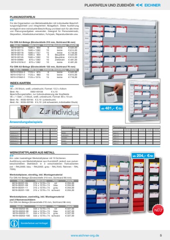 www.eichner-org.de 5F%u00fcr die Organisation von Betriebsabl%u00e4ufen mit individueller Beschriftungsm%u00f6glichkeit und integriertem Ablagefach. Diese Ausf%u00fchrung erm%u00f6glicht eine individuelle Beschriftung und l%u00e4sst sich f%u00fcr alle Arten von Planungsaufgaben verwenden. Geeignet f%u00fcr Personaleinsatz, Disposition, Arbeitsdokumentation, Fuhrpark, Reparaturdienste usw. F%u00fcr DIN A4-Belege (Einstecktiefe 210 mm, Sichtrand 96 mm)F%u00fcr DIN A5-Belege (Einstecktiefe 132 mm, Sichtrand 78 mm)VE = 20 St%u00fcck, wei%u00df, unbedruckt, Format: 12,3 x 9,8cmBest.-Nr. : 0002-00156 %u20ac 4,10Beschriftungsstreifen, zur Individualisierung der KopfleisteVE = 1 Satz = 2 St%u00fcck, wei%u00df, unbedruckt, Format: 80 x 10 cmBest.-Nr. : 9035-00194 %u20ac 2,10 (unbedruckt)Best.-Nr. : 9035-00195 %u20ac 5,10 (mit schwarzem, individuellen Druck)Produktionsplanung06:00 09:00 12:00 15:00 18:00Abteilung AAbteilung BAbteilung CAbteilung DAbteilung ETeamplanung06:00 09:00 12:00 15:00 18:00Team ATeam BTeam CTeam DTeam EWareneingangRampe 1 Rampe 2 Rampe 3 Rampe 4 Rampe 5M%u00fcllerLehmannSchallerR%u00f6slerBundlerEin- oder zweireihiger Werkstattplaner mit 10 Schienen.Ausf%u00fchrung wie Werkstattplaner aus Kunststoff, jedoch aus pulverbeschichtetem Stahlblech in 3 verschiedenen Farbvarianten (rot - RAL3000; blau - RAL5002; grau - RAL7045; Rahmen - RAL 7035).Werkstattplaner, einreihig, inkl. MontagematerialF%u00fcr DIN A4-Belege (Einstecktiefe 210 mm, Sichtrand 96 mm)Werkstattplaner, zweireihig, inkl. Montagematerial und 2 NamensschildernF%u00fcr DIN A4-Belege (Einsecktiefe 210 mm, Sichtrand 96 mm)PLANTAFELN UND ZUBEH%u00d6R << EICHNERab 481,- %u20ac/Stab 204,- %u20ac/StPLANUNGSTAFELN>>INDEX-KARTEN>>Sonderfarben auf Anfrage!WERKSTATTPLANER AUS METALL>>AnwendungsbeispieleBest.-Nr. Ma%u00dfe (mm) Schienen Beschriftung Preis/St9019-00114 1580 x 900 6 keine %u20ac 522,009019-00115 1580 x 1282 10 keine %u20ac 614,009019-00116 1580 x 1757 15 keine %u20ac 718,009019-00144 1580 x 900 6 Baupl%u00e4ne %u20ac 522,009019-00145 1580 x 1282 10 Baupl%u00e4ne %u20ac 614,009019-00984 870 x 1282 10 Zeitstrahl %u20ac 481,009019-01016-2 870 x 1282 10 keine %u20ac 481,00Best.-Nr. Ma%u00dfe (mm) Schienen Beschriftung Preis/St9019-01055-2 1125 x 675 6 keine %u20ac 522,009019-01021-2 1125 x 960 10 keine %u20ac 614,009019-01062-2 1125 x 1315 15 keine %u20ac 718,00Best.-Nr. Ma%u00dfe (mm) Farbe Preis/St9019-00201-05 315 x 1278 x 74 rot %u20ac 204,009019-00201-08 315 x 1278 x 74 blau %u20ac 204,009019-00201-11 315 x 1278 x 74 grau %u20ac 204,009019-00201-100 315 x 1278 x 74 schwarz %u20ac 204,00Best.-Nr. Ma%u00dfe (mm) Farbe Preis/St9019-00202-05 554 x 1278 x 74 rot %u20ac 327,009019-00202-08 554 x 1278 x 74 blau %u20ac 327,009019-00202-11 554 x 1278 x 74 grau %u20ac 327,009019-00202-100 554 x 1278 x 74 schwarz %u20ac 327,00NEU
