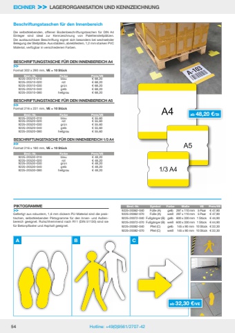 54 Hotline: +49(0)9561/2707-42Format 302 x 290 mm, VE = 10 St%u00fcckFormat 216 x 231 mm, VE = 10 St%u00fcckFormat 216 x 180 mm, VE = 10 St%u00fcckBESCHRIFTUNGSTASCHE F%u00dcR DEN INNENBEREICH A4BESCHRIFTUNGSTASCHE F%u00dcR DEN INNENBEREICH A5BESCHRIFTUNGSTASCHE F%u00dcR DEN INNENBEREICH 1/3 A4>>>>>>Best.-Nr. Farbe Preis/VE9225-20510-010 blau %u20ac 68,209225-20510-020 rot %u20ac 68,209225-20510-030 gr%u00fcn %u20ac 68,209225-20510-040 gelb %u20ac 68,209225-20510-080 hellgrau %u20ac 68,20Best.-Nr. Farbe Preis/VE9225-20520-010 blau %u20ac 55,609225-20520-020 rot %u20ac 55,609225-20520-030 gr%u00fcn %u20ac 55,609225-20520-040 gelb %u20ac 55,609225-20520-080 hellgrau %u20ac 55,60Best.-Nr. Farbe Preis/VE9225-20530-010 blau %u20ac 48,209225-20530-020 rot %u20ac 48,209225-20530-030 gr%u00fcn %u20ac 48,209225-20530-040 gelb %u20ac 48,209225-20530-080 hellgrau %u20ac 48,20Beschriftungstaschen f%u00fcr den InnenbereichDie selbstklebenden, offenen Bodenbeschriftungstaschen f%u00fcr DIN A4 Einleger sind ideal zur Kennzeichnung von Palettenstellpl%u00e4tzen. Die austauschbare Beschriftung eignet sich besonders bei wechselnder Belegung der Stellpl%u00e4tze. Aus stabilem, abriebfestem, 1,2 mm starken PVC Material, verf%u00fcgbar in verschiedenen Farben.ab 48,20 %u20ac/St EICHNER >> LAGERORGANISATION UND KENNZEICHNUNGGefertigt aus robustem, 1,6 mm dickem PU-Material sind die praktischen, selbstklebenden Piktogramme f%u00fcr den Innen- und Au%u00dfenbereich geeignet. Rutschhemmend nach R11 (DIN 51130) sind sie f%u00fcr Betonpflaster und Asphalt geeignet.PIKTOGRAMME>>Best.-Nr. Symbol Farbe Ma%u00dfe VE Preis/VE9225-20062-040 F%u00fc%u00dfe (A) gelb 297 x 110 mm 5 Paar %u20ac 47,909225-20062-070 F%u00fc%u00dfe (A) wei%u00df 297 x 110 mm 5 Paar %u20ac 47,909225-20072-040 Fu%u00dfg%u00e4nger (B) gelb 600 x 330 mm 1 St%u00fcck %u20ac 44,909225-20072-070 Fu%u00dfg%u00e4nger (B) wei%u00df 600 x 330 mm 1 St%u00fcck %u20ac 44,909225-20082-040 Pfeil (C) gelb 145 x 90 mm 10 St%u00fcck %u20ac 32,309225-20082-070 Pfeil (C) wei%u00df 145 x 90 mm 10 St%u00fcck %u20ac 32,30A B Cab 32,30 %u20ac/VE