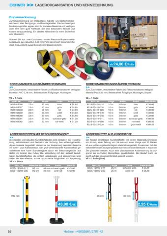 56 Hotline: +49(0)9561/2707-42EICHNER >> LAGERORGANISATION UND KENNZEICHNUNGBodenmarkierungZur Kennzeichnung von Stellpl%u00e4tzen, Arbeits- und Sicherheitsbereichen in allen Fertigungs- und Montagehallen. Die hochwertigen Markierungshilfen eignen sich f%u00fcr trockene Bereiche und verf%u00fcgen %u00fcber eine sehr gute Haftkraft. Sie sind besonders flexibel undextrem strapazierf%u00e4hig. Ein ideales Hilfsmittel f%u00fcr mehr Sicherheit und %u00dcbersicht.W%u00e4hlen Sie aus zwei Qualit%u00e4ten - unser Premium-Bodenmarkierungsband aus robustem 0,50 mm PVC eignet sich besonders f%u00fcr stark frequentierte Lagerbereiche mit Staplerverkehr.BODENMARKIERUNGSB%u00c4NDER STANDARD>>BODENMARKIERUNGSB%u00c4NDER PREMIUM>>Zum Zuschneiden, verschiedene Farben und Farbkombinationen verf%u00fcgbar; Material: PVC 0,16 mm, Belastbarkeit: Fu%u00dfg%u00e4nger, Hubwagen. VE = 1 RolleZum Zuschneiden, verschiedene Farben und Farbkombinationen verf%u00fcgbar; Material: PVC 0,50 mm, Belastbarkeit: Fu%u00dfg%u00e4nger, Hubwagen, Stapler. VE = 1 RolleBest.-Nr. L%u00e4nge Breite Farbe Preis/Rolle9218-03056 33 m 50 mm blau %u20ac 24,909218-03057 33 m 50 mm gr%u00fcn %u20ac 24,909218-03058 33 m 50 mm rot %u20ac 24,909218-03059 33 m 50 mm wei%u00df %u20ac 24,909218-03060 33 m 50 mm gelb %u20ac 24,909218-03061 33 m 50 mm schwarz-gelb %u20ac 31,309218-03062 33 m 50 mm rot-wei%u00df %u20ac 31,30Best.-Nr. L%u00e4nge Breite Farbe Preis/Rolle9225-20411-010 10 m 50 mm blau %u20ac 38,609225-20411-030 10 m 50 mm gr%u00fcn %u20ac 38,609225-20411-020 10 m 50 mm rot %u20ac 38,609225-20411-070 10 m 50 mm wei%u00df %u20ac 38,609225-20411-040 10 m 50 mm gelb %u20ac 38,609225-20411-311 10 m 50 mm schwarz-gelb %u20ac 80,509225-20411-300 10 m 50 mm rot-wei%u00df %u20ac 80,509225-20411-320 10 m 50 mm gr%u00fcn-wei%u00df %u20ac 80,50ab 24,90 %u20ac/Rolle43,90 %u20ac/VE 2,25 %u20ac/MeterBest.-Nr. H%u00f6he %u00fcber Flur %u00d8 Rohr Farbe Preis/St9225-18004-311 90 cm 48 mm schwarz-gelb %u20ac 43,909225-18004-300 90 cm 48 mm wei%u00df-rot %u20ac 43,90ABSPERRPFOSTEN MIT BESCHWERGEWICHT>>Die mobilen und robusten Kunststoffpfosten sind einfach in der Handhabung, selbststehend und flexibel in der Nutzung. Aus witterungsbest%u00e4ndigem Material hergestellt, dienen sie zur Absperrung sensibler Bereiche im Innen- und Au%u00dfenbereich. Der gro%u00df-dimensionierte Kunststofffu%u00df gew%u00e4hrleistet eine hohe Standfestigkeit durch ein Beschwergewicht aus Beton im Inneren des Fu%u00dfes. Die Verbindung mit den separat bestellbaren Kunststoffketten, die einfach anzubringen und abzunehmen sind, bilden sie eine effektive, schnell zu nutzende M%u00f6glichkeit zur Absperrung.VE = 1 St%u00fcckBest.-Nr. L%u00e4nge Farbe Preis/Rolle9225-18015-311 25 m schwarz-gelb %u20ac 56,209225-18015-300 25 m wei%u00df-rot %u20ac 56,20ABSPERRKETTE AUS KUNSTSTOFF>>Die flexibel einsetzbare Kunststoffkette mit einem Materialdurchmesser von 6 mm, einer Teilung von 36 mm und einer L%u00e4nge von 25 Metern ist aus witterungsbest%u00e4ndigem Material hergestellt. Zusammen mit den nebenstehenden Absperrpfosten k%u00f6nnen sensible Bereiche in k%u00fcrzester Zeit gesichert werden. Auch eine platzsparende Aufbewahrung ist aufgrund der schnellen Demontage gew%u00e4hrleistet. Bei Bedarf kann sie leicht auf das gew%u00fcnschte Ma%u00df gek%u00fcrzt werden. VE = 1 Rolle (25m)900 mm 36 mm 36 mm