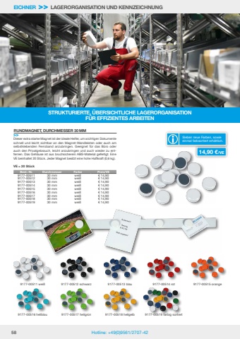 58 Hotline: +49(0)9561/2707-429177-00511 wei%u00df9177-00516 hellblau9177-00512 schwarz9177-00517 hellgr%u00fcn9177-00513 blau9177-00518 hellgelb9177-00514 rot9177-00519 farbig sortiert9177-00515 orangeEICHNER >> LAGERORGANISATION UND KENNZEICHNUNGDieser extra starke Magnet ist der ideale Helfer, um wichtigen Dokumente schnell und leicht sichtbar an den Magnet-Wandleisten oder auch am selbstklebenden Ferroband anzubringen. Geeignet f%u00fcr das B%u00fcro oder auch den Privatgebrauch, leicht anzubringen und auch wieder zu entfernen. Das Geh%u00e4use ist aus bruchsicherem ABS-Material gefertigt. Eine VE beinhaltet 20 St%u00fcck. Jeder Magnet besitzt eine hohe Haftkraft (0,6 kg).VE = 20 St%u00fcckRUNDMAGNET, DURCHMESSER 30 MM>>Best.-Nr. Durchmesser Farbe Preis/VE9177-00511 30 mm wei%u00df %u20ac 14,909177-00512 30 mm wei%u00df %u20ac 14,909177-00513 30 mm wei%u00df %u20ac 14,909177-00514 30 mm wei%u00df %u20ac 14,909177-00515 30 mm wei%u00df %u20ac 14,909177-00516 30 mm wei%u00df %u20ac 14,909177-00517 30 mm wei%u00df %u20ac 14,909177-00518 30 mm wei%u00df %u20ac 14,909177-00519 30 mm wei%u00df %u20ac 14,9014,90 %u20ac/VESTRUKTURIERTE, %u00dcBERSICHTLICHE LAGERORGANISATION F%u00dcR EFFIZIENTES ARBEITENSieben neue Farben, sowie einmal farbsortiert erh%u00e4ltlich.