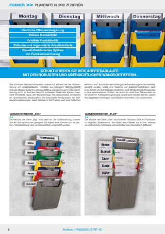 6 Hotline: +49(0)9561/2707-42EICHNER >> PLANTAFELN UND ZUBEH%u00d6RSTRUKTURIEREN SIE IHRE ARBEITSABL%u00c4UFE.MIT DEN ROBUSTEN UND %u00dcBERSICHTLICHEN WANDSORTIERERN.Deutliche EffizienzsteigerungH%u00f6here Rentabilit%u00e4tErh%u00f6hte Produktivit%u00e4tEinfache und organisierte Arbeitsabl%u00e4ufeVisuell strukturiertes Systemmit FarbkennzeichnungWANDSORTIERER %u201eBIG%u201c>>WANDSORTIERER %u201eFLAT%u201c>>Die Module der Serie %u201eBig%u201c sind ideal f%u00fcr die Aufbewahrung unserer DIN A4 Auftragstaschen geeignet. Sie haben eine F%u00fclltiefe von 34 mm.Eine Arbeitsplanung kann so %u00fcbersichtlich umgesetzt werden.Die Module der Serie %u201eFlat%u201c strukturieren Standard DIN A4 Formulare im t%u00e4glichen Arbeitsablauf. Sie haben eine F%u00fclltiefe von 9 mm, nehmenso umfangreiche Unterlagen auf und halten sie unkompliziert griffbereit.Das modulare Wandsortiersystem unterst%u00fctzt effizient bei der Strukturierung von Arbeitsabl%u00e4ufen. Gefertigt aus robustem ABS-Kunststoff sind alle Module %u00e4u%u00dferst widerstandsf%u00e4hig und %u00fcberzeugen in der Handhabung durch ihr leichtes Gewicht. Au%u00dferdem bietet das System maximale Flexibilit%u00e4t. Nach der Wandmontage des Basismoduls erm%u00f6glicht ein durchdachtes Stecksystem die individuelle Konfiguration der Aufbewahrungsl%u00f6sungen, deren Module in f%u00fcnf Farben und zwei F%u00fcllh%u00f6hen erh%u00e4ltlich sind. Auch kann der Umfang an Aufbewahrungsf%u00e4chern beliebig gew%u00e4hlt werden, wobei eine Nutzung von Zwischenaufh%u00e4ngern nach einer Anzahl von f%u00fcnf Modulen empfohlen wird. Mit den Beschriftungsclips in zwei verschiedenen Gr%u00f6%u00dfen, die durch ein einfaches Stecksystem an die einzelnen Aufbewahrungsmodule angebracht werden k%u00f6nnen, lassen sich abgelegte Unterlagen nach Bedarf beschriften und strukturieren.
