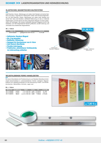 60 Hotline: +49(0)9561/2707-42EICHNER >> LAGERORGANISATION UND KENNZEICHNUNGAls starre Wandleiste (mit Polsterschaum) und flexibles Wandband (individuell abschneidbar) in unterschiedlichen Farben verf%u00fcgbar. Magnethaftend und vielseitig einsetzbar f%u00fcr die Anbringung in B%u00fcro- und Konferenzr%u00e4umen, Werkst%u00e4tten, Schulen, Lager usw.VE = 1 St%u00fcckSELBSTKLEBENDE FERRO-WANDLEISTEN>>Best.-Nr. Ausf%u00fchrung Ma%u00dfe Farbe VE Preis/St9177-00508 Leiste 1 m x 50 mm wei%u00df 10 St%u00fcck %u20ac 7,809177-00509 Leiste 1 m x 50 mm silber 10 St%u00fcck %u20ac 9,159177-00510 Band 2,5 m x 35 mm wei%u00df 1 St%u00fcck %u20ac 10,30ab 7,80 %u20ac/StH%u00e4lt Flaschen, Dosen, Werkzeuge und vieles mehr flexibel und sicher fest.Das innovative, magnetische Haltesystem bietet viele Einsatzm%u00f6glichkeiten. Es h%u00e4lt Flaschen, Dosen, Werkzeuge und vieles mehr flexibel und sicher fest. Dazu den flexiblen, rei%u00dffesten Silikonring um das zu haltende Objekt legen und das Ganze mit dem integrierten Magnet an einem geeigneten Ort anbringen. Der extrem haftstarke Neodym-Magnet ist bis 2 kg belastbar und h%u00e4lt Gegenst%u00e4nde flexibel griffbereit, schafft Ordnung und vermeidet herumstehende Gegenst%u00e4nde.VE = 1 St%u00fcckELASTISCHES, MAGNETISCHES HALTESYSTEM>>Best.-Nr. Durchmesser Preis/St9218-04597 geeignet f%u00fcr %u00d8 6-10 cm %u20ac 21,90%u2022 Haftstarker Neodym-Magnet%u2022 Bis 2 kg belastbar%u2022 Rei%u00dffester Silikonring%u2022 Geeignet f%u00fcr Durchmesser von 6-10cm %u2022 Anti-Rutsch-Oberfl%u00e4che%u2022 Flexible Anbringung%u2022 Praktischer, abnehmbarer Schl%u00fcsselclip im Lieferumfang enthaltenHaftstarkerNeodym-Magnet Flexibler, rei%u00dffester Silikonring21,90 %u20ac/St