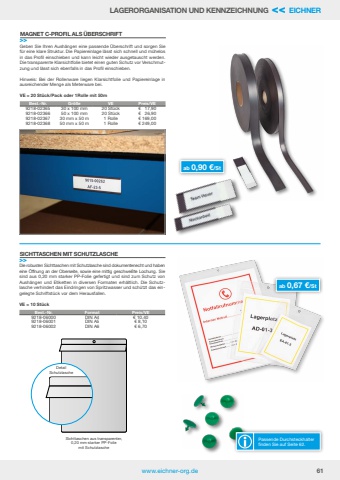 www.eichner-org.de 61LAGERORGANISATION UND KENNZEICHNUNG << EICHNERBest.-Nr. Format Preis/VE9218-06000 DIN A4 %u20ac 10,409218-06001 DIN A5 %u20ac 8,109218-06002 DIN A6 %u20ac 6,70Die robusten Sichttaschen mit Schutzlasche sind dokumentenecht und haben eine %u00d6ffnung an der Oberseite, sowie eine mittig geschwei%u00dfte Lochung. Sie sind aus 0,20 mm starker PP-Folie gefertigt und sind zum Schutz von Aush%u00e4ngen und Etiketten in diversen Formaten erh%u00e4ltlich. Die Schutzlasche verhindert das Eindringen von Spritzwasser und sch%u00fctzt das eingelegte Schriftst%u00fcck vor dem Herausfallen.VE = 10 St%u00fcckSICHTTASCHEN MIT SCHUTZLASCHE>>ab 0,67 %u20ac/St Best.-Nr. Gr%u00f6%u00dfe VE Preis/VE9218-02365 30 x 100 mm 20 St%u00fcck %u20ac 17,909218-02366 50 x 100 mm 20 St%u00fcck %u20ac 26,909218-02367 30 mm x 50 m 1 Rolle %u20ac 169,009218-02368 50 mm x 50 m 1 Rolle %u20ac 249,00Geben Sie Ihren Aush%u00e4ngen eine passende %u00dcberschrift und sorgen Sie f%u00fcr eine klare Struktur. Die Papiereinlage l%u00e4sst sich schnell und m%u00fchelos in das Profil einschieben und kann leicht wieder ausgetauscht werden. Die transparente Klarsichtfolie bietet einen guten Schutz vor Verschmutzung und l%u00e4sst sich ebenfalls in das Profil einschieben. Hinweis: Bei der Rollenware liegen Klarsichtfolie und Papiereinlage in ausreichender Menge als Meterware bei.VE = 20 St%u00fcck/Pack oder 1Rolle mit 50mMAGNET C-PROFIL ALS %u00dcBERSCHRIFT>>ab 0,90 %u20ac/St Sichttaschen aus transparenter, 0,20 mm starker PP-Foliemit SchutzlascheDetail SchutzlaschePassende Durchsteckhalter finden Sie auf Seite 62.