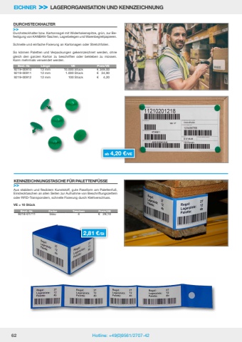 62 Hotline: +49(0)9561/2707-42EICHNER >> LAGERORGANISATION UND KENNZEICHNUNG2,81 %u20ac/StAus stabilem und flexiblem Kunststoff, gute Passform am Palettenfu%u00df, Einstecktaschen an allen Seiten zur Aufnahme von Beschriftungszetteln oder RFID-Transpondern, schnelle Fixierung durch Klettverschluss.VE = 10 St%u00fcckKENNZEICHNUNGSTASCHE F%u00dcR PALETTENF%u00dcSSE>>Best.-Nr. Farbe Taschen Preis/VE9218-01711 blau 4 %u20ac 28,10Durchsteckhalter bzw. Kartonnagel mit Widerhakenspitze, gr%u00fcn, zur Befestigung von KANBAN-Taschen, Lagerbelegen und Warenbegleitpapieren. Schnelle und einfache Fixierung an Kartonagen oder Stretchfolien. So k%u00f6nnen Paletten und Verpackungen gekennzeichnet werden, ohne gleich den ganzen Karton zu beschriften oder bekleben zu m%u00fcssen. Kann mehrmals verwendet werden.DURCHSTECKHALTER>>Best.-Nr. L%u00e4nge VE Preis/VE9219-00910 12 mm 10.000 St%u00fcck %u20ac 349,009219-00911 12 mm 1.000 St%u00fcck %u20ac 34,909219-00912 12 mm 100 St%u00fcck %u20ac 4,20ab 4,20 %u20ac/VE