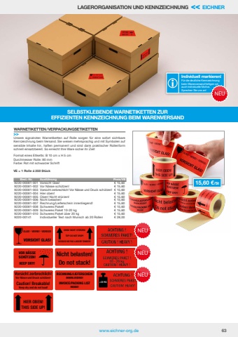 Best.-Nr. Ausf%u00fchrung Preis/VE9220-00081-001 Vorsicht Glas! %u20ac 15,609220-00081-002 Vor N%u00e4sse sch%u00fctzen! %u20ac 15,609220-00081-003 Vorsicht zerbrechlich! Vor N%u00e4sse und Druck sch%u00fctzen! %u20ac 15,609220-00081-004 Hier oben! %u20ac 15,609220-00081-005 Oben! Nicht st%u00fcrzen! %u20ac 15,609220-00081-006 Nicht belasten! %u20ac 15,609220-00081-007 Rechnung/Lieferschein innenliegend! %u20ac 15,609220-00081-008 Schweres Paket! %u20ac 15,609220-00081-009 Schweres Paket 10-20 kg %u20ac 15,609220-00081-010 Schweres Paket %u00fcber 20 kg %u20ac 15,609220-00141 Individueller Text nach Wunsch ab 20 Rollen %u20ac 28,00Unsere signalroten Warnetiketten auf Rolle sorgen f%u00fcr eine sofort sichtbare Kennzeichnung beim Versand. Sie weisen mehrsprachig und mit Symbolen auf sensible Inhalte hin, haften permanent und sind dank praktischer Rollenform schnell einsatzbereit. So erreicht Ihre Ware sicher ihr Ziel!Format eines Etiketts: B 10 cm x H 5 cmDurchmesser Rolle: 80 mmFarbe: Rot mit schwarzer SchriftVE = 1 Rolle %u00e1 250 St%u00fcckWARNETIKETTEN/VERPACKUNGSETIKETTEN>>Individuell markieren!F%u00fcr die deutliche Kennzeichnung beim Warenversand fertigen wir auch individuelle Motive.Sprechen Sie uns an!GLAS! %u2022 VERRE! %u2022 VIDRIOS!VORSICHT GLAS!VOR N%u00c4SSE SCH%u00dcTZEN!KEEP DRY!HIER OBEN!THIS SIDE UP!OBEN! NICHT ST%u00dcRZEN!TOP! DO NOT DROP!DESSUS! NE PAS LAISSER TOMBER!Nicht belasten!Do not stack!RECHNUNG/LIEFERSCHEININNENLIEGEND!INVOICE/PACKING LISTINSIDE!Vorsicht zerbrechlich!Vor N%u00e4sse und Druck sch%u00fctzen!Caution! Breakable!Keep dry and do not load!www.eichner-org.de 63LAGERORGANISATION UND KENNZEICHNUNG << EICHNER15,60 %u20ac/St NEUNEUNEUNEUSELBSTKLEBENDE WARNETIKETTEN ZUREFFIZIENTEN KENNZEICHNUNG BEIM WARENVERSAND
