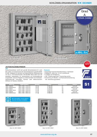 www.eichner-org.de 67Autoschl%u00fcsseltresor zertifi ziert gem%u00e4%u00df Sicherheitsstufe S1 nach EN 14450 und entsprechend der Sicherheitsstufe A gem%u00e4%u00df VDMA 24 992. Geeignet zur sicheren und %u00fcbersichtlichen Aufbewahrung von bis zu 140 Autoschl%u00fcsseln. Die Modelle dieser Serie sind mit speziellen Hakenleisten f%u00fcr Autoschl%u00fcssel und Schl%u00fcsselbunde ausgestattet. Inklusive Register zur Dokumentation der Schl%u00fcsselorganisation.Mit manuellem Schloss oder elektronischem Schloss mit Tastatur erh%u00e4ltlich.Features:%u2022 Doppelbart-Hochsicherheitsschloss, 2 Schl%u00fcssel%u2022 Klappgriff , silber (ca. 12 mm vorstehend)%u2022 4-seitige T%u00fcrverriegelung%u2022 180%u00b0 T%u00fcr%u00f6ffnungswinkel, T%u00fcranschlag rechts%u2022 Vorrichtung f%u00fcr Boden- und R%u00fcckwandverankerunginkl. VerankerungsmateriaBest.-Nr. 9201-00056 Best.-Nr. 9201-00057 Best.-Nr. 9201-00058SCHL%u00dcSSELORGANISATION << EICHNERAUTOSCHL%u00dcSSELTRESOR>>Best.-Nr. Ma%u00dfe (HxBxT) Gewicht Preis Schl%u00fcsselhaken Schloss9201-00056 436 x 460 x 140 mm 22 kg %u20ac 484,00 31 manuell9201-00056-ELS 436 x 460 x 140 mm 22 kg %u20ac 766,00 31 elektronisch9201-00057 576 x 460 x 140 mm 31 kg %u20ac 546,00 35 manuell9201-00057-ELS 576 x 460 x 140 mm 31 kg %u20ac 819,00 35 elektronisch9201-00058 636 x 460 x 206 mm 41 kg %u20ac 693,00 70 manuell9201-00058-ELS 636 x 460 x 206 mm 41 kg %u20ac 966,00 70 elektronischab 484,- %u20ac/St Best.-Nr. 9201-00057 Best.-Nr. 9201-00056S1Mit manuellem sowie elektronischem Schloss erh%u00e4ltlich.NEU