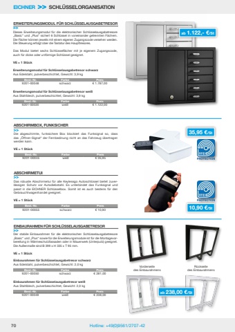 70 Hotline: +49(0)9561/2707-42EICHNER >> SCHL%u00dcSSELORGANISATIONDieses Erweiterungsmodul f%u00fcr die elektronischen Schl%u00fcsselausgabetresore %u201eBasic%u201c und %u201ePlus%u201c sichert 6 Schl%u00fcssel in voneinander getrennten F%u00e4chern. Die F%u00e4cher k%u00f6nnen jeweils mit einem eigenen Zugangscode versehen werden. Die Steuerung erfolgt %u00fcber die Tastatur des Haupttresores.Das Modul bietet sechs Schl%u00fcsself%u00e4cher mit je eigenem Zugangscode, auch f%u00fcr dicke oder unf%u00f6rmige Schl%u00fcssel geeignet.VE = 1 St%u00fcckERWEITERUNGSMODUL F%u00dcR SCHL%u00dcSSELAUSGABETRESOR>>ab 1.122,- %u20ac/St Best.-Nr. Farbe Preis9201-00048 schwarz %u20ac 1.787,00Erweiterungsmodul f%u00fcr Schl%u00fcsselausgabetresor schwarzAus Edelstahl, pulverbeschichtet, Gewicht: 3,9 kgBest.-Nr. Farbe Preis9201-00050 schwarz %u20ac 281,00Best.-Nr. Farbe Preis9201-00020 wei%u00df %u20ac 1.122,00Erweiterungsmodul f%u00fcr Schl%u00fcsselausgabetresor wei%u00dfAus Stahlblech, pulverbeschichtet, Gewicht: 3,9 kgBest.-Nr. Farbe Preis9201-00049 wei%u00df %u20ac 238,00Best.-Nr. Farbe Preis9201-00045 wei%u00df %u20ac 35,9535,95 %u20ac/St Der stabile Einbaurahmen f%u00fcr die elektronischen Schl%u00fcsselausgabetresore %u201eBasic%u201c und %u201ePlus%u201c sowie f%u00fcr die Erweiterungsmodule ist f%u00fcr die Montagevorbereitung in W%u00e4rmeschutzfassaden oder in Mauerwerk (Unterputz) geeignet. Die Au%u00dfenma%u00dfe sind B 399 x H 335 x T 95 mm.VE = 1 St%u00fcckEINBAURAHMEN F%u00dcR SCHL%u00dcSSELAUSGABETRESOR>>Einbaurahmen f%u00fcr Schl%u00fcsselausgabetresor schwarzAus Edelstahl, pulverbeschichtet, Gewicht: 2,0 kgEinbaurahmen f%u00fcr Schl%u00fcsselausgabetresor wei%u00dfAus Stahlblech, pulverbeschichtet, Gewicht: 2,0 kgVorderseite des EinbaurahmensR%u00fcckseite des EinbaurahmensDie abgeschirmte, funksichere Box blockiert das Funksignal so, dassdas %u201e%u00d6ffnen-Signal%u201c der Fernbedinung nicht an das Fahrzeug %u00fcbertragen werden kann.VE = 1 St%u00fcckABSCHIRMBOX, FUNKSICHER>>Das robuste Abschirmetui f%u00fcr alle Keylessgo Autoschl%u00fcssel bietet zuverl%u00e4ssigen Schutz vor Autodiebstahl. Es unterbindet das Funksignal und passt in die EICHNER Schl%u00fcsselbox. Somit ist es auch bestens f%u00fcr den Gebrauchtwagenhandel geeignet.VE = 1 St%u00fcckABSCHIRMETUI>>Best.-Nr. Farbe Preis 9201-00055 schwarz %u20ac 10,90 10,90 %u20ac/Stab 238,00 %u20ac/St