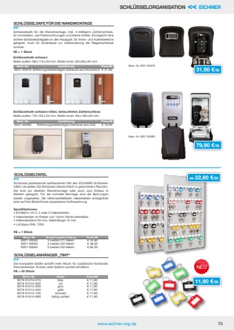 Schl%u00fcssel professionell aufbewahren! Mit den EICHNER Schl%u00fcsseltafeln verwalten Sie Schl%u00fcssel %u00fcbersichtlich in gesicherten R%u00e4umen. Sie sind zur direkten Wandmontage oder auch zum Einbau in M%u00f6beln geeignet. F%u00fcr die schnelle Montage sind die Bohrungen bereits vorgesehen. Die h%u00f6henverstellbaren Hakenleisten erm%u00f6glichen eine auf Ihre Bed%u00fcrfnisse anpassbare Aufbewahrung.Spezifikationen:%u2022 Erh%u00e4ltlich mit 3, 4 oder 5 Hakenleisten%u2022 Hakenleisten im Raster von 14mm h%u00f6henverstellbar%u2022 Hakenabstand 30 mm, Hakenl%u00e4nge 15 mm%u2022 Lichtgrau RAL 7035VE = 1 St%u00fcckSCHL%u00dcSSELTAFEL>>Best.-Nr. Anzahl Leisten/Haken Preis/VE9201-00052 3 Leisten/21 Haken %u20ac 32,609201-00053 4 Leisten/32 Haken %u20ac 48,509201-00054 5 Leisten/50 Haken %u20ac 65,20ab 32,60 %u20ac/St Die kompakte Gr%u00f6%u00dfe schafft mehr Raum f%u00fcr zus%u00e4tzliche Schl%u00fcssel. Peronalisierbar. Einzeln oder farblich sortiert erh%u00e4ltlich.VE = 50 St%u00fcckSCHL%u00dcSSELANH%u00c4NGER %u201eTINY%u201c>>Best.-Nr. Farbe Preis/VE9219-01414-010 blau %u20ac 11,909219-01414-020 rot %u20ac 11,909219-01414-030 gr%u00fcn %u20ac 11,909219-01414-040 gelb %u20ac 11,909219-01414-100 schwarz %u20ac 11,909219-01414-990 farbig sortiert %u20ac 11,9011,90 %u20ac/St www.eichner-org.de 73SCHL%u00dcSSELORGANISATION << EICHNERNEUSchl%u00fcsselsafe f%u00fcr die Wandmontage, inkl. 4-stelligem Zahlenschloss, f%u00fcr Immobilien, wie Ferienwohnungen und kleine Hotels. Erm%u00f6glicht eine sichere Schl%u00fcssel%u00fcbergabe an den Hausgast, f%u00fcr Innen- und Au%u00dfenbereiche geeignet. Auch f%u00fcr Autoh%u00e4user zur Aufbewahrung der Wagenschl%u00fcssel nutzbar.SCHL%u00dcSSELSAFE F%u00dcR DIE WANDMONTAGE>>31,90 %u20ac/St 79,90 %u20ac/St VE = 1 St%u00fcckSchl%u00fcsselsafe schwarzMa%u00dfe au%u00dfen: 96x115x40 mm, Ma%u00dfe innen: 60x85x20 mmSchl%u00fcsselsafe schwarz-silber, beleuchtetes ZahlenschlossMa%u00dfe au%u00dfen: 70x125x55 mm, Ma%u00dfe innen: 60x106x25 mmBest.-Nr. Ausf%u00fchrung Preis/St9201-00079 Witterungsbest%u00e4ndiges Geh%u00e4use aus Aluminium %u20ac 31,90Best.-Nr. Ausf%u00fchrung Preis/St9201-00080 Witterungsbest%u00e4ndiges Geh%u00e4use aus Zink %u20ac 79,90Best.-Nr. 9201-00079Best.-Nr. 9201-00080