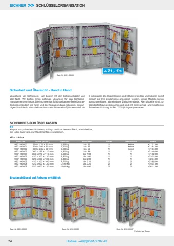 74 Hotline: +49(0)9561/2707-42EICHNER >> SCHL%u00dcSSELORGANISATIONPerforiert auf Bogen.Korpus aus pulverbeschichtetem, schlag- und kratzfestem Blech, abschlie%u00dfbar, ein- oder zwei-t%u00fcrig, zur Wandmontage vorgesehen.VE = 1 St%u00fcckBest.-Nr. 9201-00002 Best.-Nr. 9201-00003 Best.-Nr. 9201-00007Best.-Nr. 9201-00008Verwaltung von Schl%u00fcsseln - am besten mit den Schl%u00fcsselk%u00e4sten von EICHNER. Wir bieten Ihnen optimale L%u00f6sungen f%u00fcr das Schl%u00fcsselmanagement von heute. Die hochwertige Schl%u00fcsselkasten-Serie f%u00fcr praktisch jeden Bedarf. Die T%u00fcren und der Korpus sind aus robustem, einwandigen Stahlblech, abschlie%u00dfbar durch ein Sicherheits-Zylinderschlo%u00df mit 2 Schl%u00fcsseln. Die Hakenleisten sind h%u00f6henverstellbar und k%u00f6nnen somit einfach auf Ihre Bed%u00fcrfnisse angepasst werden. Einige Modelle bieten ausschwenkbare, abnehmbare Zwischenw%u00e4nde. Alle Modelle sind zur Wandbefestigung vorgesehen und sind mit einer schlag- und kratzfesten Pulverbeschichtung in RAL 7035 (lichtgrau) versehen.SICHERHEITS-SCHL%u00dcSSELKASTEN>>ab 71,- %u20ac/St Sicherheit und %u00dcbersicht - Hand in HandErsatzschl%u00fcssel auf Anfrage erh%u00e4ltlich.Best.-Nr. Ma%u00dfe (HxBxT) Gewicht Schl%u00fcssel T%u00fcren Trennwand Preis9201-00000 250 x 170 x 50 mm 1,65 kg bis 22 1 keine %u20ac 71,009201-00001 300 x 200 x 60 mm 2,20 kg bis 35 1 keine %u20ac 81,009201-00002 360 x 235 x 60 mm 3,20 kg bis 50 1 keine %u20ac 104,009201-00003 360 x 235 x 110 mm 4,80 kg bis 86 1 1 %u20ac 140,009201-00004 360 x 270 x 110 mm 5,30 kg bis 108 1 1 %u20ac 152,009201-00005 420 x 300 x 130 mm 6,80 kg bis 160 1 1 %u20ac 202,009201-00006 520 x 300 x 130 mm 8,40 kg bis 200 1 1 %u20ac 234,009201-00007 420 x 300 x 160 mm 9,20 kg bis 232 1 2 %u20ac 285,009201-00008 420 x 600 x 130 mm 12,90 kg bis 320 2 2 %u20ac 407,009201-00009 520 x 600 x 130 mm 15,60 kg bis 400 2 2 %u20ac 611,00