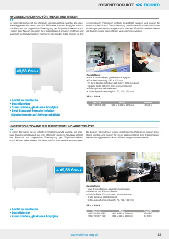 www.eichner-org.de 83In vielen Bereichen ist ein effektiver Infektionsschutz wichtig. Die glasklare Hygieneschutzwand aus vier Millimeter starkem Acrylglas sch%u00fctzt das Personal vor ungewollter %u00dcbertragung per Tr%u00f6pfcheninfektion durch Husten oder Niesen. Sie l%u00e4sst sich im Handumdrehen montieren. Die beiden F%u00fc%u00dfe k%u00f6nnen in drei verschiedenen Positionen einfach angesteckt werden und sorgen f%u00fcr einen stabilen Stand. Eine Fl%u00e4chendesinfektion der Hygienewand kann effizient vorgenommen werden. HYGIENESCHUTZWAND F%u00dcR B%u00dcROTISCHE UND ARBEITSPL%u00c4TZE>>In vielen Bereichen ist ein effektiver Infektionsschutz wichtig. Die glasklare Hygieneschutzwand aus f%u00fcnf Millimeter starkem Acrylglas sch%u00fctzt das Personal vor ungewollter %u00dcbertragung per Tr%u00f6pfcheninfektion durch Husten oder Niesen. Sie ist in zwei gro%u00dfz%u00fcgigen Formaten erh%u00e4ltlich und l%u00e4sst sich im Handumdrehen montieren. Die beiden F%u00fc%u00dfe k%u00f6nnen in drei verschiedenen Positionen einfach angesteckt werden und sorgen f%u00fcr einen stabilen Stand. Durch die mittig positionierte Durchreiche k%u00f6nnen Unterlagen problemlos ausgetauscht werden. Eine Fl%u00e4chendesinfektion der Hygienewand kann effizient vorgenommen werden. HYGIENESCHUTZWAND F%u00dcR THEKEN UND TRESEN>>%u2022 Leicht zu montieren%u2022 Desinfizierbar%u2022 5 mm starkes, glasklares Acrylglas%u2022 Zwei Standard-Formate lieferbar (Sonderformate auf Anfrage m%u00f6glich)%u2022 Leicht zu montieren%u2022 Desinfizierbar%u2022 4 mm starkes, glasklares AcrylglasAusstattung:%u2022 Aus 5 mm starkem, glasklarem Acrylglas%u2022 Durchreiche mittig, 250 x 100 mm%u2022 In zwei Gr%u00f6%u00dfen lieferbar, 600 oder 1.000 mm breit%u2022 Stabile F%u00fc%u00dfe 200 mm breit, zum Anstecken%u2022 F%u00fc%u00dfe optional selbstklebend%u2022 3 Steckpositionen m%u00f6glich: 70, 100, 130 mmVE = 1 St%u00fcckBest.-Nr. Ma%u00dfe Preis/St9127-01793-060 600 x 1.000 x 200 mm 49,58 %u20acAusstattung:%u2022 Aus 4 mm starkem, glasklarem Acrylglas%u2022 Lieferbar mit 800 mm Breite%u2022 Stabile F%u00fc%u00dfe 200 mm breit, zum Anstecken%u2022 F%u00fc%u00dfe optional selbstklebend%u2022 3 Steckpositionen m%u00f6glich: 70, 100, 130 mmVE = 1 St%u00fcckBest.-Nr. Ma%u00dfe Preis/St9127-01797-080 800 x 660 x 200 mm 49,58 %u20ac9127-01797-100 800 x 660 x 200 mm 57,98 %u20ac49,58 %u20ac/St%u00fcckab 49,58 %u20ac/St%u00fcckHYGIENEPRODUKTE << EICHNER