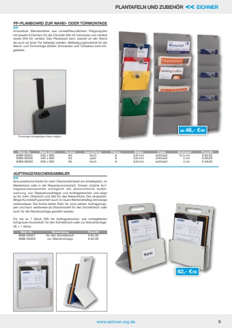 www.eichner-org.de 9PLANTAFELN UND ZUBEH%u00d6R << EICHNERInnovativer Wandsortierer aus umweltfreundlichem Polypropylen mit jeweils 6 F%u00e4chern f%u00fcr die Formate DIN A4 horizontal und vertikal sowie DIN A5 vertikal. Das Planboard kann sowohl an der Wand als auch an einer T%u00fcr befestigt werden. Befestigungsmaterial f%u00fcr die Wand- und T%u00fcrmontage (D%u00fcbel, Schrauben und T%u00fcrhaken) wird mitgeliefert.T%u00fcrmontage mit beigef%u00fcgten Haken m%u00f6glich.Eine praktische Kartei f%u00fcr mehr %u00dcbersichtlichkeit am Arbeitsplatz, im Meisterb%u00fcro oder in der Reparaturwerkstatt. Dieser stabile Auftragstaschensammler erm%u00f6glicht die %u00fcbersichtliche Aufbewahrung von Reparaturauftr%u00e4gen und Auftragstaschen und sorgt so f%u00fcr mehr %u00dcbersicht und Zeit f%u00fcr das Wesentliche. Der strapazierf%u00e4hige Kunststoff garantiert auch im rauen Werkstattalltag eine lange Lebensdauer. Die Kartei bietet Platz f%u00fcr circa sieben Auftragsmappen und kann wahlweise als Standmodell f%u00fcr den Schreibtisch oder auch f%u00fcr die Wandmontage gew%u00e4hlt werden.F%u00fcr bis zu 7 St%u00fcck DIN A4 Auftragstaschen, aus schlagfestem lichtgrauen Kunststoff, f%u00fcr den Schreibtisch oder zur Wandmontage. VE = 1 St%u00fcckAUFTRAGSTASCHENSAMMLER>>PP-PLANBOARD ZUR WAND- ODER T%u00dcRMONTAGE>>ab 48,- %u20ac/St62,- %u20ac/StBest.-Nr. Verwendung Preis/St9089-00027 f%u00fcr den Schreibtisch %u20ac 62,009089-00028 zur Wandmontage %u20ac 62,00Best.-Nr. Ma%u00dfe (mm) Format Ausrichtung F%u00e4cher St%u00e4rke Farbe Sichtrand Preis/St9089-00001 250 x 900 A4 hoch 6 0,8 mm anthrazit 12,5 cm %u20ac 60,009089-00002 340 x 900 A4 quer 6 0,8 mm anthrazit 4 cm %u20ac 60,009089-00003 200 x 900 A5 hoch 6 0,8 mm anthrazit 4 cm %u20ac 48,00