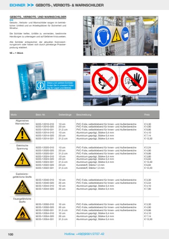 100 Hotline: +49(0)9561/2707-42PR%u00c4SENTATION UND ORGANISATIONF%u00dcR LAGER UND BETRIEBMotiv Best.-Nr. Seitenl%u00e4nge Beschreibung PreisAllgemeines Warnzeichen 9225-12010-0109225-12010-0209225-12010-0319225-12014-0109225-12014-0209225-12014-03110 cm20 cm31,5 cm10 cm20 cm31,5 cmPVC-Folie, selbstklebend f%u00fcr Innen- und Au%u00dfenbereichePVC-Folie, selbstklebend f%u00fcr Innen- und Au%u00dfenbereichePVC-Folie, selbstklebend f%u00fcr Innen- und Au%u00dfenbereicheAluminium gepr%u00e4gt, St%u00e4rke 0,4 mmAluminium gepr%u00e4gt, St%u00e4rke 0,4 mmAluminium gepr%u00e4gt, St%u00e4rke 0,4 mm%u20ac 3,30%u20ac 4,90%u20ac 9,86%u20ac 4,10%u20ac 7,14%u20ac 13,30Elektrische Spannung 9225-12020-0109225-12020-0209225-12020-0319225-12024-0109225-12024-0209225-12024-0319225-12022-0209225-12022-03110 cm20 cm31,5 cm10 cm20 cm31,5 cm20 cm31,5 cmPVC-Folie, selbstklebend f%u00fcr Innen- und Au%u00dfenbereichePVC-Folie, selbstklebend f%u00fcr Innen- und Au%u00dfenbereichePVC-Folie, selbstklebend f%u00fcr Innen- und Au%u00dfenbereicheAluminium gepr%u00e4gt, St%u00e4rke 0,4 mmAluminium gepr%u00e4gt, St%u00e4rke 0,4 mmAluminium gepr%u00e4gt, St%u00e4rke 0,4 mmKunststoff, St%u00e4rke 1,0 mmKunststoff, St%u00e4rke 1,0 mm%u20ac 2,24%u20ac 4,90%u20ac 9,86%u20ac 3,80%u20ac 6,84%u20ac 13,30%u20ac 6,84%u20ac 12,20Explosionsgef%u00e4hrliche Stoffe9225-12040-0109225-12040-0209225-12044-0109225-12044-02010 cm20 cm10 cm20 cmPVC-Folie, selbstklebend f%u00fcr Innen- und Au%u00dfenbereichePVC-Folie, selbstklebend f%u00fcr Innen- und Au%u00dfenbereicheAluminium gepr%u00e4gt, St%u00e4rke 0,4 mmAluminium gepr%u00e4gt, St%u00e4rke 0,4 mm%u20ac 3,30%u20ac 5,54%u20ac 4,10%u20ac 7,90Feuergef%u00e4hrlicheStoffe9225-12050-0109225-12050-0209225-12050-0319225-12054-0109225-12054-0209225-12054-03110 cm20 cm31,5 cm10 cm20 cm31,5 cmPVC-Folie, selbstklebend f%u00fcr Innen- und Au%u00dfenbereichePVC-Folie, selbstklebend f%u00fcr Innen- und Au%u00dfenbereichePVC-Folie, selbstklebend f%u00fcr Innen- und Au%u00dfenbereicheAluminium gepr%u00e4gt, St%u00e4rke 0,4 mmAluminium gepr%u00e4gt, St%u00e4rke 0,4 mmAluminium gepr%u00e4gt, St%u00e4rke 0,4 mm%u20ac 3,30%u20ac 4,90%u20ac 9,86%u20ac 4,10%u20ac 7,14%u20ac 13,30Gebots-, Verbots- und Warnschilder sorgen im betrieblichen Umfeld und an Arbeitspl%u00e4tzen f%u00fcr Sicherheit und Struktur.Die Schilder helfen, Unf%u00e4lle zu vermeiden, bestimmte Handlungen zu untersagen und auf Gefahren hinzuweisen.Alle Schilder entsprechen der aktuellen Kennzeichnungsnorm oder haben sich durch jahrelange Praxiserprobung etabliert.VE = 1 St%u00fcckEICHNER >> GEBOTS-, VERBOTS- & WARNSCHILDERGEBOTS-, VERBOTS- UND WARNSCHILDER>>Diese und weitere Schilder finden Sie in unserem Katalog f%u00fcr Lager und Betrieb