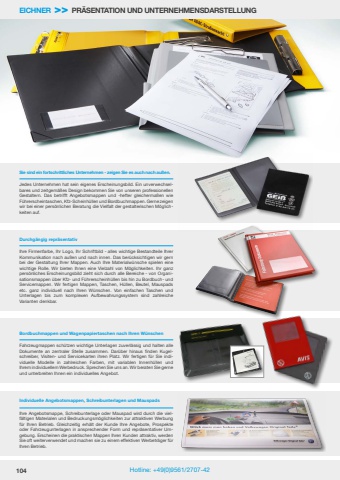 104 Hotline: +49(0)9561/2707-42EICHNER >> PR%u00c4SENTATION UND UNTERNEHMENSDARSTELLUNGFahrzeugmappen sch%u00fctzen wichtige Unterlagen zuverl%u00e4ssig und halten alle Dokumente an zentraler Stelle zusammen. Dar%u00fcber hinaus finden Kugelschreiber, Visiten- und Servicekarten ihren Platz. Wir fertigen f%u00fcr Sie individuelle Modelle in zahlreichen Farben, mit variablen Innenh%u00fcllen und Ihrem individuellem Werbedruck. Sprechen Sie uns an. Wir beraten Sie gerne und unterbreiten Ihnen ein individuelles Angebot.Bordbuchmappen und Wagenpapiertaschen nach Ihren W%u00fcnschenSie sind ein fortschrittliches Unternehmen - zeigen Sie es auch nach au%u00dfen.Durchg%u00e4ngig repr%u00e4sentativJedes Unternehmen hat sein eigenes Erscheinungsbild. Ein unverwechselbares und zeitgem%u00e4%u00dfes Design bekommen Sie von unseren professionellen Gestaltern. Das betrifft Angebotsmappen und -hefter gleicherma%u00dfen wie F%u00fchrerscheintaschen, Kfz-Scheinh%u00fcllen und Bordbuchmappen. Gerne zeigen wir bei einer pers%u00f6nlichen Beratung die Vielfalt der gestalterischen M%u00f6glichkeiten auf.Ihre Firmenfarbe, Ihr Logo, Ihr Schriftbild - alles wichtige Bestandteile Ihrer Kommunikation nach au%u00dfen und nach innen. Das ber%u00fccksichtigen wir gern bei der Gestaltung Ihrer Mappen. Auch Ihre Materialw%u00fcnsche spielen eine wichtige Rolle. Wir bieten Ihnen eine Vielzahl von M%u00f6glichkeiten. Ihr ganz pers%u00f6nliches Erscheinungsbild zieht sich durch alle Bereiche - von Organisationsmappen %u00fcber Kfz- und F%u00fchrerscheinh%u00fcllen bis hin zu Bordbuch- und Servicemappen. Wir fertigen Mappen, Taschen, H%u00fcllen, Beutel, Mauspads etc. ganz individuell nach Ihren W%u00fcnschen. Von einfachen Taschen und Unterlagen bis zum komplexen Aufbewahrungssystem sind zahlreiche Varianten denkbar.Ihre Angebotsmappe, Schreibunterlage oder Mauspad wird durch die vielf%u00e4ltigen Materialen und Bedruckungsm%u00f6glichkeiten zur attraktiven Werbung f%u00fcr Ihren Betrieb. Gleichzeitig erh%u00e4lt der Kunde Ihre Angebote, Prospekte oder Fahrzeugunterlagen in ansprechender Form und repr%u00e4sentativer Umgebung. Erscheinen die praktischen Mappen Ihren Kunden attraktiv, werden Sie oft weiterverwendet und machen sie zu einem effektiven Werbetr%u00e4ger f%u00fcr Ihren Betrieb.Individuelle Angebotsmappen, Schreibunterlagen und Mauspads