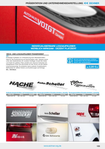 www.eichner-org.de 105PR%u00c4SENTATION UND UNTERNEHMENSDARSTELLUNG << EICHNERINDIVIDUALISIERBARE LOGOAUFKLEBERWERBLICH WIRKSAM - DEZENT PLATZIERTHECK- UND LOGOAUFKLEBER TRANSPARENT>>Einfarbiger Aufkleber zur Unterst%u00fctzung Ihrer Werbeaktivit%u00e4ten. Ideal f%u00fcr die Positionierung auf Heckscheiben oder -klappen sowie unter dem Seitenblinker am vorderen Kotfl%u00fcgel. Anzahl der Zeilen und Optik frei w%u00e4hlbar, Preis versteht sich inklusive Vorkosten (Im angegebenen Preis sind alle Kosten f%u00fcr den Druck und die Gestaltung ber%u00fccksichtigt. Es entstehen keine weiteren Zusatzkosten!).Mehrpreise f%u00fcr weitere Farben und Ausf%u00fchrungen auf Anfrage.VE = 100 St%u00fcckab 2,09 %u20ac/StMit den individualisierbaren Aufkleber transportieren Sie Ihre Markenbotschaftdezent, aber werbewirksam. Best.-Nr. Ma%u00dfe Preis/St9220-00118 90 x 35 mm %u20ac 2,09Au%u00dfenkonturgeschnitten auf transparenter FolieBest.-Nr. Ma%u00dfe Preis/St9220-00123 150 x 30 mm %u20ac 2,34Konturgeschnittene Einzelbuchstaben, einzeiligBest.-Nr. Ma%u00dfe Preis/St9220-00124 150 x 40 mm %u20ac 2,59Konturgeschnittene Einzelbuchstaben, zweizeilig