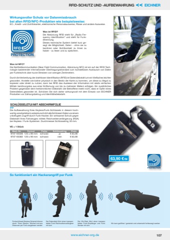 www.eichner-org.de 107RFID-SCHUTZ UND -AUFBEWAHRUNG << EICHNERWirkungsvoller Schutz vor Datenmissbrauch bei allen RFID/NFC-Produkten wie beispielsweise:EC-, Kredit- und Zutrittskarten, elektronische Personalausweise, P%u00e4sse und andere Ausweise.Was ist NFC?Die Nahfeldkommunikation (Near Field Communication, Abk%u00fcrzung NFC) ist ein auf der RFID Technologie basierender internationaler %u00dcbertragungsstandard zum kontaktlosen Austausch von Daten per Funktechnik %u00fcber kurze Strecken von wenigen Zentimetern. Durch die Verbreitung der drahtlosen Identifikation (RFID) ist Datendiebstahl um ein Vielfaches leichter geworden. Anstelle wie bisher physisch in den Besitz der Karte zu kommen, um diese zu illegal zu kopieren oder direkt zu nutzen, kann bei RFID das Auslesen der Information mit relativ einfachen Mitteln ber%u00fchrungslos aus einer Entfernung von bis zu mehreren Metern erfolgen. Ein zus%u00e4tzliches Problem gegen%u00fcber dem herk%u00f6mmlichen Diebstahl: der Betroffene merkt nicht, dass er Opfer eines Datendiebes geworden ist. Sch%u00fctzen Sie sich daher wirkungsvoll mit dem Einsatz von EICHNER Produkten vor Zahlungsbetrug und Identit%u00e4tsdiebstahl.Was ist RFID?Die Abk%u00fcrzung RFID steht f%u00fcr %u201eRadio Frequency Identification%u201c und steht f%u00fcr Funkerkennung. Dieses technische System bietet kurz gesagt die M%u00f6glichkeit, Daten - ohne sie zu ber%u00fchren oder Sichtkontakt zu ihnen zu haben - zu lesen und zu speichern.SCHL%u00dcSSELETUI MIT ABSCHIRMFOLIE>>Die Aufbewahrung Ihres Keyless/Funk-Schl%u00fcssels in diesem hochwertig verarbeitetem Lederetui sch%u00fctzt alle Schl%u00fcssel-Daten vor einem unbefugten Zugriff durch Funk-Hacker. Ein wirksamer Schutz gegen Diebstahl Ihres Fahrzeuges mittels Reichweitenverl%u00e4ngerung (RSA) bei Keyless / Funk-Systemen. Durchmesser Schl%u00fcsselring 30 mm.VE = 1 St%u00fcckBest.-Nr. Format Farbe Schl%u00fcsselring Preis 9707-00336 125 x 80 mm schwarz ja %u20ac 63,909707-00382 120 x 90 mm schwarz nein %u20ac 63,90Funkschl%u00fcssel (Keyless Syteme) k%u00f6nnen durch T%u00fcren, Mauern, Taschen und aus Distanzen per Funk ausgelesen werdenDer Datendieb f%u00fchrt einen transportablen Funk-Reichweitenverl%u00e4ngerer mit sichDer Kfz-Dieb f%u00fchrt einen transportablen Funk-Empf%u00e4nger und FunkSender mit sichKfz kann ge%u00f6ffnet / gestartet und unbemerkt fortbewegt werdenSo funktioniert ein Hackerangriff per Funk63,90 %u20ac/St