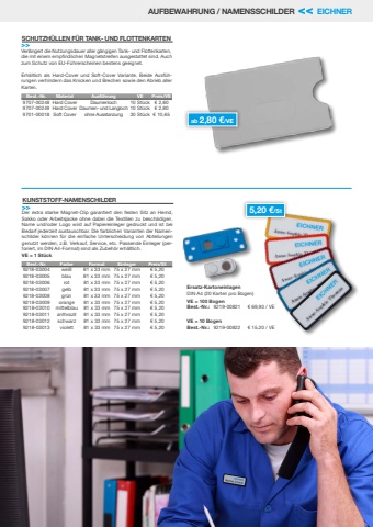 www.eichner-org.de 109AUFBEWAHRUNG / NAMENSSCHILDER << EICHNERKUNSTSTOFF-NAMENSCHILDER>>Der extra starke Magnet-Clip garantiert den festen Sitz an Hemd, Sakko oder Arbeitsjacke ohne dabei die Textilien zu besch%u00e4digen. Name und/oder Logo wird auf Papiereinleger gedruckt und ist bei Bedarf jederzeit austauschbar. Die farblichen Varianten der Namenschilder k%u00f6nnen f%u00fcr die einfache Unterscheidung von Abteilungen genutzt werden, z.B. Verkauf, Service, etc. Passende Einleger (perforiert, im DIN A4-Format) sind als Zubeh%u00f6r erh%u00e4ltlich.VE = 1 St%u00fcckBest.-Nr. Farbe Format Einleger Preis/St9218-03004 wei%u00df 81 x 33 mm 75 x 27 mm %u20ac 5,209218-03005 blau 81 x 33 mm 75 x 27 mm %u20ac 5,209218-03006 rot 81 x 33 mm 75 x 27 mm %u20ac 5,209218-03007 gelb 81 x 33 mm 75 x 27 mm %u20ac 5,209218-03008 gr%u00fcn 81 x 33 mm 75 x 27 mm %u20ac 5,209218-03009 orange 81 x 33 mm 75 x 27 mm %u20ac 5,209218-03010 mittelblau 81 x 33 mm 75 x 27 mm %u20ac 5,209218-03011 anthrazit 81 x 33 mm 75 x 27 mm %u20ac 5,209218-03012 schwarz 81 x 33 mm 75 x 27 mm %u20ac 5,209218-03013 violett 81 x 33 mm 75 x 27 mm %u20ac 5,20Ersatz-KartoneinlagenDIN A4 (20 Karten pro Bogen)VE = 100 BogenBest.-Nr.: 9219-00821 %u20ac 69,90 / VEVE = 10 BogenBest.-Nr.: 9219-00822 %u20ac 15,20 / VE5,20 %u20ac/StSCHUTZH%u00dcLLEN F%u00dcR TANK- UND FLOTTENKARTEN>>Verl%u00e4ngert die Nutzungsdauer aller g%u00e4ngigen Tank- und Flottenkarten,die mit einem empfindlichen Magnetstreifen ausgestattet sind. Auch zum Schutz von EU-F%u00fchrerscheinen bestens geeignet.Erh%u00e4ltlich als Hard-Cover und Soft-Cover Variante. Beide Ausf%u00fchrungen verhindern das Knicken und Brechen sowie den Abrieb aller Karten.Best.-Nr. Material Ausf%u00fchrung VE Preis/VE9707-00248 Hard Cover Daumenloch 10 St%u00fcck %u20ac 2,809707-00249 Hard Cover Daumen- und Langloch 10 St%u00fcck %u20ac 2,809701-00018 Soft Cover ohne Ausstanzung 30 St%u00fcck %u20ac 10,65ab 2,80 %u20ac/VE