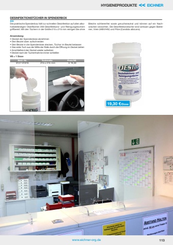 www.eichner-org.de 113Die praktische Spenderbox h%u00e4lt zur schnellen Desinfektion auf allen alkoholbest%u00e4ndigen Oberfl%u00e4chen 200 Desinfektions- und Reinigungst%u00fcchern griffbereit. Mit den T%u00fcchern in der Gr%u00f6%u00dfe 215 x 215 mm reinigen Sie ohne Bleiche schlierenfrei sowie geruchsneutral und k%u00f6nnen auf ein Nachwischen verzichten. Die Desinfektionst%u00fccher sind wirksam gegen Bakterien, Viren (HBV/HIV) und Pilze (Candida albicans).DESINFEKTIONST%u00dcCHER IN SPENDERBOX>>Anwendung:%u2022 Deckel der Spenderdose abnehmen%u2022 Den Beutel oben aufschneiden%u2022 Den Beutel in die Spenderdose stecken, T%u00fccher im Beutel belassen%u2022 Das erste Tuch aus der Mitte der Rolle durch die %u00d6ffnung im Deckel ziehen%u2022 Anschlie%u00dfend den Deckel wieder aufsetzen%u2022 Deckel nach der Tuchentnahme immer schlie%u00dfenVE = 1 DoseBest.-Nr. Tuchma%u00dfe Preis/VE9127-01819 215 x 215 mm %u20ac 19,3019,30 %u20ac/DoseHYGIENEPRODUKTE << EICHNER