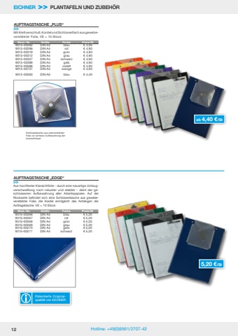 12 Hotline: +49(0)9561/2707-42Mit Klettverschlu%u00df, Kordel und Schl%u00fcsselfach aus gewebeverst%u00e4rkter Folie, VE = 10 St%u00fcckSchl%u00fcsseltasche aus netzverst%u00e4rkter Folie zur sicheren Aufbewahrung der Autoschl%u00fcsselAus hochfester Klarsichtfolie - durch eine neuartige Umbugverschwei%u00dfung noch robuster und stabiler - dient der geschlossenen Aufbewahrung aller Arbeitspapiere. Auf der R%u00fcckseite befindet sich eine Schl%u00fcsseltasche aus gewebeverst%u00e4rkter Folie, die Kordel erm%u00f6glicht das Anh%u00e4ngen der Auftragstasche. VE = 10 St%u00fcckAUFTRAGSTASCHE %u201eEDGE%u201c>>AUFTRAGSTASCHE %u201ePLUS%u201c>>5,20 %u20ac/St ab 4,40 %u20ac/St EICHNER >> PLANTAFELN UND ZUBEH%u00d6RPatentierte Originalqualit%u00e4t von EICHNERBest.-Nr. Gr%u00f6%u00dfe Farbe Preis/St9015-00262 DIN A4 blau %u20ac 4,909015-00296 DIN A4 rot %u20ac 4,909015-00319 DIN A4 gr%u00fcn %u20ac 4,909015-00312 DIN A4 grau %u20ac 4,909015-00327 DIN A4 schwarz %u20ac 4,909015-00389 DIN A4 gelb %u20ac 4,909015-00586 DIN A4 violett %u20ac 4,909015-00737 DIN A4 orange %u20ac 4,909015-00263 DIN A5 blau %u20ac 4,40Best.-Nr. Gr%u00f6%u00dfe Farbe Preis/St9015-00266 DIN A4 blau %u20ac 5,209015-00267 DIN A4 rot %u20ac 5,209015-00268 DIN A4 gr%u00fcn %u20ac 5,209015-00269 DIN A4 grau %u20ac 5,209015-00270 DIN A4 gelb %u20ac 5,209015-00271 DIN A4 schwarz %u20ac 5,20