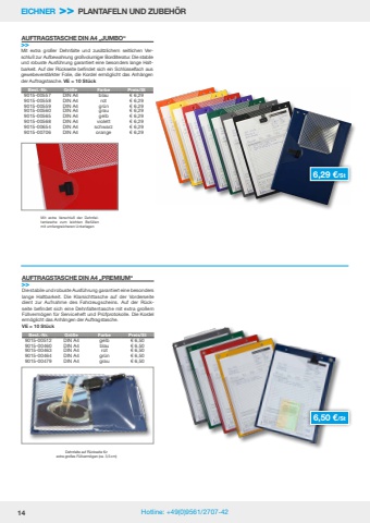 14 Hotline: +49(0)9561/2707-42Dehnfalte auf R%u00fcckseite f%u00fcr extra gro%u00dfes F%u00fcllverm%u00f6gen (ca. 3,5 cm)Die stabile und robuste Ausf%u00fchrung garantiert eine besonders lange Haltbarkeit. Die Klarsichttasche auf der Vorderseite dient zur Aufnahme des Fahrzeugscheins. Auf der R%u00fcckseite befindet sich eine Dehnfaltentasche mit extra gro%u00dfem F%u00fcllverm%u00f6gen f%u00fcr Serviceheft und Pr%u00fcfprotokolle. Die Kordel erm%u00f6glicht das Anh%u00e4ngen der Auftragstasche.VE = 10 St%u00fcckMit extra gro%u00dfer Dehnfalte und zus%u00e4tzlichem seitlichen Verschlu%u00df zur Aufbewahrung gro%u00dfvolumiger Bordliteratur. Die stabile und robuste Ausf%u00fchrung garantiert eine besonders lange Haltbarkeit. Auf der R%u00fcckseite befindet sich ein Schl%u00fcsselfach aus gewebeverst%u00e4rkter Folie, die Kordel erm%u00f6glicht das Anh%u00e4ngen der Auftragstasche. VE = 10 St%u00fcckMit extra Verschlu%u00df der Dehnfaltentasche zum leichten Bef%u00fcllen mit umfangreicheren UnterlagenEICHNER >> PLANTAFELN UND ZUBEH%u00d6RAUFTRAGSTASCHE DIN A4 %u201eJUMBO%u201c>>AUFTRAGSTASCHE DIN A4 %u201ePREMIUM%u201c>>Best.-Nr. Gr%u00f6%u00dfe Farbe Preis/St9015-00557 DIN A4 blau %u20ac 6,299015-00558 DIN A4 rot %u20ac 6,299015-00559 DIN A4 gr%u00fcn %u20ac 6,299015-00560 DIN A4 grau %u20ac 6,299015-00565 DIN A4 gelb %u20ac 6,299015-00568 DIN A4 violett %u20ac 6,299015-00654 DIN A4 schwarz %u20ac 6,299015-00706 DIN A4 orange %u20ac 6,29Best.-Nr. Gr%u00f6%u00dfe Farbe Preis/St9015-00512 DIN A4 gelb %u20ac 6,509015-00460 DIN A4 blau %u20ac 6,509015-00463 DIN A4 rot %u20ac 6,509015-00464 DIN A4 gr%u00fcn %u20ac 6,509015-00479 DIN A4 grau %u20ac 6,506,29 %u20ac/St 6,50 %u20ac/St