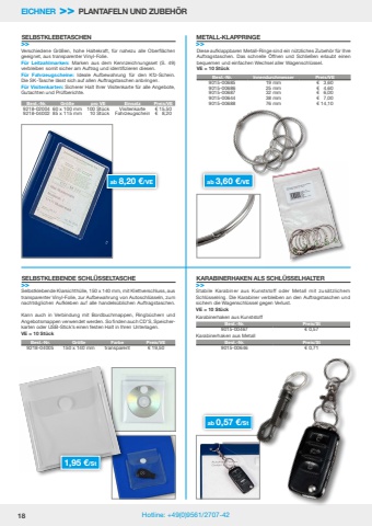 18 Hotline: +49(0)9561/2707-42Diese aufklappbaren Metall-Ringe sind ein n%u00fctzliches Zubeh%u00f6r f%u00fcr Ihre Auftragstaschen. Das schnelle %u00d6ffnen und Schlie%u00dfen erlaubt einen bequemen und einfachen Wechsel aller Wagenschl%u00fcssel.VE = 10 St%u00fcckStabile Karabiner aus Kunststoff oder Metall mit zus%u00e4tzlichem Schl%u00fcsselring. Die Karabiner verbleiben an den Auftragstaschen und sichern die Wagenschl%u00fcssel gegen Verlust.VE = 10 St%u00fcckSelbstklebende Klarsichth%u00fclle, 150 x 140 mm, mit Klettverschluss, aus transparenter Vinyl-Folie, zur Aufbewahrung von Autoschl%u00fcsseln, zum nachtr%u00e4glichen Aufkleben auf alle handels%u00fcblichen Auftragstaschen.Kann auch in Verbindung mit Bordbuchmappen, Ringb%u00fcchern und Angebotsmappen verwendet werden. So finden auch CD%u2019S, Speicherkarten oder USB-Stick%u2019s einen festen Halt in Ihren Unterlagen. VE = 10 St%u00fcckVerschiedene Gr%u00f6%u00dfen, hohe Haltekraft, f%u00fcr nahezu alle Oberfl%u00e4chen geeignet, aus transparenter Vinyl-Folie.F%u00fcr Leitzahlmarken: Marken aus dem Kennzeichnungsset (S. 49) verbleiben somit sicher am Auftrag und identifizieren diesen.F%u00fcr Fahrzeugscheine: Ideale Aufbewahrung f%u00fcr den Kfz-Schein. Die SK-Tasche l%u00e4sst sich auf allen Auftragstaschen anbringen.F%u00fcr Visitenkarten: Sicherer Halt Ihrer Visitenkarte f%u00fcr alle Angebote, Gutachten und Pr%u00fcfberichte.EICHNER >> PLANTAFELN UND ZUBEH%u00d6RSELBSTKLEBETASCHEN>>SELBSTKLEBENDE SCHL%u00dcSSELTASCHE>>METALL-KLAPPRINGE>>KARABINERHAKEN ALS SCHL%u00dcSSELHALTER>>Best.-Nr. Gr%u00f6%u00dfe pro VE Einsatz Preis/VE9218-02004 60 x 100 mm 100 St%u00fcck Visitenkarte %u20ac 15,509218-04002 85 x 115 mm 10 St%u00fcck Fahrzeugschein %u20ac 8,20Best.-Nr. Gr%u00f6%u00dfe Farbe Preis/VE9218-04005 150 x 140 mm transparent %u20ac 19,50Best.-Nr. Innendurchmesser Preis/VE9015-00685 19 mm %u20ac 3,609015-00686 25 mm %u20ac 4,609015-00687 32 mm %u20ac 6,009015-00644 38 mm %u20ac 7,009015-00688 76 mm %u20ac 14,10ab 8,20 %u20ac/VE1,95 %u20ac/Stab 0,57 %u20ac/Stab 3,60 %u20ac/VEBest.-Nr. Preis/St9015-00467 %u20ac 0,57Best.-Nr. Preis/St9015-00646 %u20ac 0,71Karabinerhaken aus KunststoffKarabinerhaken aus Metall