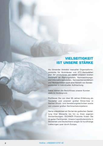 2 Hotline: +49(0)9561/2707-42VIELSEITIGKEITIST UNSERE ST%u00c4RKEAls f%u00fchrender Anbieter manueller Organisationsprodukte f%u00fcr Autoh%u00e4user und KFZ-Werkst%u00e4tten aller Art produzieren wir neben unserem breiten Sortiment an Planungstafeln, Kennzeichnungsund Informationsprodukten, Kennzeichenverst%u00e4rkern und Werbeschildern auch eine Vielzahl von Sonderprodukten in individueller Aufmachung.Dabei stehen die Bed%u00fcrfnisse unserer Kundenstets im Vordergrund.Profitieren Sie von %u00fcber 90 Jahren Erfahrung als Hersteller und unserem gro%u00dfen Know-how in Sachen Druck- und Veredelungstechniken sowievon unserer gro%u00dfen Sortimentskompetenz. Gerne unterst%u00fctzen wir Sie bei der grafischen Gestaltung Ihrer W%u00fcnsche bis hin zu Ihren eigenen Sonderl%u00f6sungen. EICHNER Produkte finden Sie im guten Fachhandel. Unsere Logistikstandorte in Slowenien und Deutschland sorgen f%u00fcr kurzfristige Lieferungen quer durch Europa.