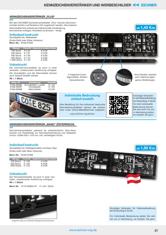 www.eichner-org.de 21Individuelle Bedruckungeinfach bestelltEine Bestellung f%u00fcr Ihre individuell bedruckte Kennzeichenverst%u00e4rker k%u00f6nnen Sie einfach %u00fcber unser Online-Bestellformular aufgeben:www.eichner-org.de/kzvEinmalige Vorkosten f%u00fcr die Datenaufbereitung bei Erstauftrag: %u20ac 30,00.F%u00fcr eine individuelle Bedruckung k%u00f6nnen Sie sich auch mit uns in Verbindung setzen, wir beraten Sie gern.Hoch flexibel, deshalb auch ideal bei gebogenen Sto%u00dfstangen.4 integrierte Unterlegscheiben. Einfach herausdr%u00fccken.KENNZEICHENVERST%u00c4RKER UND WERBESCHILDER << EICHNERab 1,43 %u20ac/St Menge Preis/St Aufpreis je weitere Farbe100 St%u00fcck %u20ac 2,02 %u20ac 0,09200 St%u00fcck %u20ac 1,81 %u20ac 0,09300 St%u00fcck %u20ac 1,65 %u20ac 0,09500 St%u00fcck %u20ac 1,54 %u20ac 0,091.000 St%u00fcck %u20ac 1,43 %u20ac 0,09Best.-Nr. Ausf%u00fchrung Preis/VE9106-00995 Grundplatte + Leiste %u20ac 1,439106-00997 Grundplatte %u20ac 1,059106-00999 Klemmleiste %u20ac 0,38Kennzeichenverst%u00e4rker passend f%u00fcr %u00f6sterreichische Auto-Kennzeichen mit Feststellclip zur Kennzeichenfixierung und Diebstahlschutz. Gr%u00f6%u00dfe 520 x 120 mm, inkl. einfarbigem Druck.Mit dem EICHNER Nummernschildhalter %u201ePlus%u201c k%u00f6nnen Nummernschilder einfach und flexibel an Kfz angebracht werden. Die moderne Verschlu%u00dftechnik erlaubt eine blitzschnelle Handhabung. Kennzeichen einlegen, Klickleiste andr%u00fccken - fertig!Einmalige Vorkosten f%u00fcr Datenaufbereitung bei Erstauftrag %u20ac 30,00.F%u00fcr individuelle Bedruckung setzen Sie sich mit uns in Verbindung, wir beraten Sie gern. Integrierte Clips zur einfachen Montage der Kennzeichen.ab 1,50 %u20ac/St KENNZEICHENVERST%u00c4RKER %u201eBASIC%u201c (%u00d6STERREICH)>>KENNZEICHENVERST%u00c4RKER %u201ePLUS%u201c>>Grundplatte mit Unterlegscheiben und Easy-Clips(Farbe wei%u00df oder silber inklusive)Best.-Nr.: 9106-01006Grundplatte inkl. Werbeleiste(Farbe Wei%u00df oder Silber inklusive)Best.-Nr.: 9106-01002Menge Preis/St Aufpreis je weitere Farbe100 St%u00fcck %u20ac 1,80 %u20ac 0,09500 St%u00fcck %u20ac 1,65 %u20ac 0,091000 St%u00fcck %u20ac 1,55 %u20ac 0,09Der Kennzeichenhalter ist auch in einer neutralen, unbedruckten Ausf%u00fchrung verf%u00fcgbar. VE = 1 St%u00fcckBest.-Nr. 9115-00000-AT %u20ac 1,50 / St%u00fcckDer Kennzeichenverst%u00e4rker ist auch in einer neutralen, unbedruckten Ausf%u00fchrung verf%u00fcgbar. Die Grundplatte und die Klemmleiste k%u00f6nnen auch separat bestellt werden. VE = 1 St%u00fcckIndividuell bedrucktIndividuell bedrucktUnbedrucktUnbedruckt