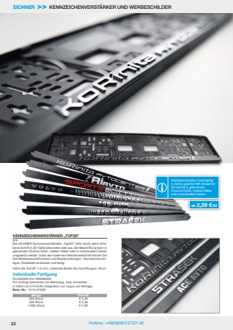 22 Hotline: +49(0)9561/2707-42EICHNER >> KENNZEICHENVERST%u00c4RKER UND WERBESCHILDERMenge Preis/St300 St%u00fcck %u20ac 2,49500 St%u00fcck %u20ac 2,391.000 St%u00fcck %u20ac 2,29Der EICHNER Nummernschildhalter %u201eTop3D%u201c sieht durch seine erhabene Schrift in 3D-Optik besonders edel aus. Die Beschriftung kann in gl%u00e4nzender Chrome-Optik, mattem Silber oder in individuellen Farben umgesetzt werden. Dank der modernen Verschlusstechnik k%u00f6nnen Sie Ihre Werbebotschaft einfach und flexibel anbringen %u2013 Kennzeichen einlegen, Klickleiste andr%u00fccken und fertig!H%u00f6he der Schrift: 1,5 mm, maximale Breite des Schriftzuges: 40cmKENNZEICHENVERST%u00c4RKER %u201eTOP3D%u201c>>Grundplatte inkl. WerbeleistePro Auftrag berechnen wir Werkzeug- bzw. Vorkosten in H%u00f6he von 275 EUR, Integration von Logos auf Anfrage.Best.-Nr.: 9115-01000Individuelle Fertigungab 2,29 %u20ac/St Werbebotschaften hochwertig in Szene gesetzt! Mit erhabener 3D-Schrift in gl%u00e4nzender Chrome-Optik, mattem Silber oder individuellen Farben.