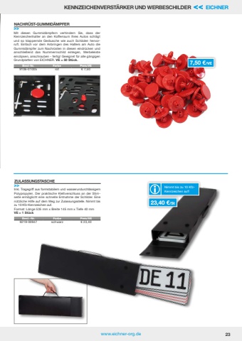 www.eichner-org.de 23KENNZEICHENVERST%u00c4RKER UND WERBESCHILDER << EICHNERMit diesen Gummid%u00e4mpfern verhindern Sie, dass der Kennzeichenhalter an den Kofferraum Ihres Autos schl%u00e4gt und so klappernde Ger%u00e4usche wie auch Sch%u00e4den hervorruft. Einfach vor dem Anbringen des Halters am Auto die Gummid%u00e4mpfer zum Nachr%u00fcsten in diesen eindr%u00fccken und anschlie%u00dfend das Nummernschild einlegen, Werbeleiste einclipsen, anschrauben - fertig! Geeignet f%u00fcr alle g%u00e4ngigen Grundplatten von EICHNER. VE = 50 St%u00fcck. 7,50 %u20ac/VE NACHR%u00dcST-GUMMID%u00c4MPFER>>Best-Nr. Farbe Preis/VE9106-01005 rot %u20ac 7,50Inkl. Tragegriff aus formstabilem und wasserundurchl%u00e4ssigem Polypropylen. Der praktische Klettverschluss an der Stirnseite erm%u00f6glicht eine schnelle Entnahme der Schilder. Eine n%u00fctzliche Hilfe auf dem Weg zur Zulassungsstelle. Nimmt bis zu 10 Kfz-Kennzeichen auf.Format: L%u00e4nge 535 mm x Breite 145 mm x Tiefe 40 mmVE = 1 St%u00fcckNimmt bis zu 10 KfzKennzeichen auf!23,40 %u20ac/St ZULASSUNGSTASCHE>>Best.-Nr. Farbe Preis/VE9219-00947 schwarz %u20ac 23,40