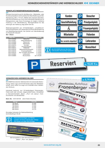 www.eichner-org.de 25KENNZEICHENVERST%u00c4RKER UND WERBESCHILDER << EICHNERBest.-Nr. Aufdruck Preis/St9219-00266 Besucher %u20ac 18,509219-00267 Gesch%u00e4ftsleitung %u20ac 18,509219-00268 Reserviert %u20ac 18,509219-00269 Mitarbeiter %u20ac 18,509219-00270 Kunden %u20ac 18,509219-00271 Privatparkplatz %u20ac 18,509219-00275 Patienten %u20ac 18,509219-00276 Behindertenparkplatz %u20ac 18,509219-00278 Frauenparkplatz %u20ac 18,509219-00279 Nur vorw%u00e4rts einparken %u20ac 18,509219-00280 Lieferanten %u20ac 18,509219-00809 Wunschtext ab %u20ac 20,90ab 18,50 %u20ac/St Bei EICHNER k%u00f6nnen Sie Ihrenindividuellen Wunschtext bestellen!Voll kompatibel zu den Kennzeichenverst%u00e4rkern %u201eBasic%u201c, %u201ePlus%u201c und %u201eEpoxy%u201c.KENNZEICHEN-WERBESCHILDER >>Saubere Kennzeichnung f%u00fcr alle Besucher-, Mitarbeiter- oder Kundenparkpl%u00e4tze in einer praktischen Wandhalterung als Set; Abmessung: 520 x 110 mm. W%u00e4hlen Sie zwischen Standardoder Wunschtexten aus. Auch eine individuelle Gestaltung mit Piktogrammen oder Ihrem Firmenlogo ist m%u00f6glich. Einfache Fixierung in der Wandhalterung. Montagematerial f%u00fcr das Anbringen der Halterung liegt jedem Set bei.Reservierungsschild aus UV-best%u00e4ndigem, umweltfreundlichem Polypropylen, inkl. passender Universal-Wandhalterung und Befestigungsmaterial, Set (Schild und Wandhalterung) im Polybeutel verpacktVE: 1 St%u00fcckPARKPLATZ RESERVIERUNGSSCHILDER>>Kennzeicheneinleger und Werbeschilder mit Ihrem individuellen Design. Wir freuen uns %u00fcber Ihre Anfrage.ab 2,75 %u20ac/St EICHNER Kennzeichen-Werbeschild mit individueller Bedruckung, Ihrem Logo und Firmennamen oder Ihrer Werbebotschaft, sticht sofort ins Auge und hinterl%u00e4%u00dft einen bleibenden Eindruck.Individuell bedruckt, aus UV-best%u00e4ndigem Polypropylen, Farbe wei%u00df oder schwarz, abgerundete Ecken, kompatibel zu Kennzeichenhalter %u201eBasic%u201c, %u201ePlus%u201c und %u201eEpoxy%u201c, frostbruchsicher und abwaschbar.Best.-Nr.: 9219-00100 (eine Farbe inklusive)Einmalige Vorkosten f%u00fcr Datenaufbereitung bei Erstauftrag %u20ac 25,00.Menge Preis/St50 St%u00fcck %u20ac 3,80100 St%u00fcck %u20ac 3,25150 St%u00fcck %u20ac 3,00200 St%u00fcck %u20ac 2,85300 St%u00fcck %u20ac 2,75