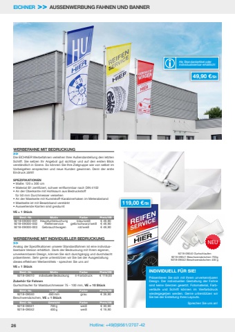 26 Hotline: +49(0)9561/2707-42EICHNER >> AUSSENWERBUNG FAHNEN UND BANNERDie EICHNER Werbefahnen verleihen Ihrer Au%u00dfendarstellung den letzten Schliff. Sie setzen Ihr Angebot gut sichtbar und auf den ersten Blick verst%u00e4ndlich in Szene. So k%u00f6nnen Sie Ihre Zielgruppe wie von selbst im Vorbeigehen ansprechen und neue Kunden gewinnen. Denn der erste Eindruck z%u00e4hlt!SPEZIFIKATIONEN%u2022 Ma%u00dfe: 120 x 300 cm%u2022 Material B1 zertifiziert, schwer entflammbar nach DIN 4102%u2022 An der Oberkante mit Hohlsaum aus Bedruckstoff f%u00fcr 50 mm Durchmesser versehen%u2022 An der Mastseite mit Kunststoff-Karabinerhaken im Meterabstand%u2022 Mastseite ist mit Besatzband verst%u00e4rkt%u2022 Auswehende Kanten sind ges%u00e4umtVE = 1 St%u00fcckZubeh%u00f6r f%u00fcr FahnenGurtschlaufen f%u00fcr Mastdurchmesser 75 - 100 mm, VE = 10 St%u00fcckBeschwers%u00e4ckchen, VE = 1 St%u00fcckAnalog der Spezifikationen unserer Standardfahnen ist eine individualiserbare Version erh%u00e4ltlich. Dank der Bedruckung mit Ihrem eigenen, unverkennbaren Design, k%u00f6nnen Sie sich durchg%u00e4ngig und durchdacht pr%u00e4sentieren. Sehr gerne unterst%u00fctzen wir Sie bei der Ausgestaltung dieses effektiven Werbemittels - sprechen Sie uns an!VE = 1 St%u00fcckWERBEFAHNE MIT BEDRUCKUNGWERBEFAHNE MIT INDIVIDUELLER BEDRUCKUNG>>>>Best.-Nr. Motiv Farbe Preis/VE9218-09000-001 Hauptuntersuchung blau/wei%u00df %u20ac 49,909218-09000-002 Reifenservice gelb/schwarz/wei%u00df %u20ac 49,909218-09000-003 Gebrauchtwagen rot/wei%u00df %u20ac 49,90Best.-Nr. Motiv Farbe Preis/VE9218-09010 individuelle Bedruckung 4-Farbdruck %u20ac 119,00Best.-Nr. L%u00e4nge Farbe Preis/VE9218-09040 450 mm grau %u20ac 39,90Best.-Nr. Gewicht Farbe Preis/VE9218-09041 700 g wei%u00df %u20ac 30,909218-09042 400 g wei%u00df %u20ac 19,90INDIVIDUELL F%u00dcR SIE!Pr%u00e4sentieren Sie sich mit Ihrem unverkennbaren Design. Der individuellen Gestaltung der Fahne sind keine Grenzen gesetzt. Fotomaterial, Farbverl%u00e4ufe und Schrift k%u00f6nnen im Vierfarbdruck wiedergegeben werden. Gerne unterst%u00fctzen wir Sie bei der Erstellung Ihres Layouts. Sprechen Sie uns an!9218-09040 Gurtschlaufen9218-09041 Beschwers%u00e4ckchen 700g9218-09042 Beschwers%u00e4ckchen 400 gAls Standardartikel oder individualisierbar erh%u00e4ltlich!119,00 %u20ac/St49,90 %u20ac/StNEU