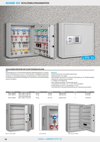 28 Hotline: +49(0)9561/2707-42Schl%u00fcsselschrank mit benutzerfreundlichem Elektronikschloss zur strukturierten Aufbewahrung von bis zu 120 Schl%u00fcsseln. Vielf%u00e4ltige Einsatzm%u00f6glichkeiten zur Schl%u00fcsselverwaltung. Modellvarianten mit Einwurfschachterm%u00f6glichen die praktische R%u00fcckgabe von Schl%u00fcsseln. Schl%u00fcsselanh%u00e4nger optional erh%u00e4ltlich.Features:%u2022 Elektronikschloss mit Not%u00f6ffnungsschloss%u2022 Benutzercode: 3-8 stellig%u2022 Mit Drehgriff, akustische und optische Signalisierung von Tastatureingabe%u2022 Batterie im Lieferumfang enthalten%u2022 1-seitige T%u00fcrverriegelung%u2022 90%u00ba T%u00fcr%u00f6ffnungswinkel, T%u00fcranschlag rechts%u2022 Hakenleisten im Raster von 14 mm h%u00f6henverstellbar%u2022 Hakenabstand: 30 mm, Hakenl%u00e4nge: 15 mm%u2022 Vorrichtung f%u00fcr R%u00fcckwandverankerung inkl. VerankerungsmaterialBest.-Nr. 9201-00032 Einwurf%u00f6ffnung Best.-Nr. 9201-00030EICHNER >> SCHL%u00dcSSELORGANISATIONSCHL%u00dcSSELTRESORE MIT ELEKTRONIKSCHLOSS>>ab 219,- %u20ac/St Best.-Nr. Ma%u00dfe (HxBxT) Gewicht Schl%u00fcssel Schloss T%u00fcren Preis9201-00029 430 x 460 x 130 mm 15 kg bis 80 elektronisch 1 %u20ac 219,009201-00032 430 x 460 x 130 mm 15 kg bis 80 elektronisch 1 %u20ac 254,00(mit Einwurf%u00f6ffnung)9201-00030 630 x 460 x 130 mm 19 kg bis 120 elektronisch 1 %u20ac 294,00Best.-Nr. 9201-00029