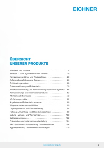 www.eichner-org.de 3Plantafeln und Zubeh%u00f6r . . . . . . . . . . . . . . . . . . . . . . . . . . . . . . . . . . . . 4 Einsteck-/T-Card Systemtafeln und Zubeh%u00f6r . . . . . . . . . . . . . . . . . . 19Kennzeichenverst%u00e4rker und Werbeschilder . . . . . . . . . . . . . . . . . . . . 20Au%u00dfenwerbung Fahnen und Banner . . . . . . . . . . . . . . . . . . . . . . . . . 26Schl%u00fcsselorganisation . . . . . . . . . . . . . . . . . . . . . . . . . . . . . . . . . . . . 28Preisauszeichnung und Pr%u00e4sentation . . . . . . . . . . . . . . . . . . . . . . . . 50Arbeitsplatzsicherung und Kennzeichnung elektrischer Systeme . . 58Kennzeichnungs- und Informationsprodukte . . . . . . . . . . . . . . . . . . 62Kfz-Werkstatt-Formulare . . . . . . . . . . . . . . . . . . . . . . . . . . . . . . . . . . 72Kfz-Schutzprodukte . . . . . . . . . . . . . . . . . . . . . . . . . . . . . . . . . . . . . 82Angebots- und Pr%u00e4sentationsmappen . . . . . . . . . . . . . . . . . . . . . . . 88Wagenpapiertaschen und H%u00fcllen . . . . . . . . . . . . . . . . . . . . . . . . . . . 90Lagerorganisation und Kennzeichnung . . . . . . . . . . . . . . . . . . . . . . . 94Rettungs-, Fluchtweg- und Brandschutzschilder . . . . . . . . . . . . . . . 99Gebots-, Verbots- und Warnschilder . . . . . . . . . . . . . . . . . . . . . . . . 100Betriebseinrichtung . . . . . . . . . . . . . . . . . . . . . . . . . . . . . . . . . . . . . 102Pr%u00e4sentation und Unternehmensdarstellung . . . . . . . . . . . . . . . . . . 104RFID-Schutz und -Aufbewahrung / Namensschilder . . . . . . . . . . . 106Hygieneprodukte, Tischklemmen/-halterungen . . . . . . . . . . . . . . . 110%u00dcBERSICHTUNSERER PRODUKTE
