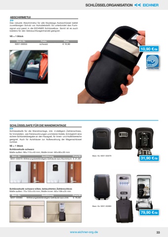 www.eichner-org.de 33SCHL%u00dcSSELORGANISATION << EICHNERSchl%u00fcsselsafe f%u00fcr die Wandmontage, inkl. 4-stelligem Zahlenschloss, f%u00fcr Immobilien, wie Ferienwohnungen und kleine Hotels. Erm%u00f6glicht eine sichere Schl%u00fcssel%u00fcbergabe an den Hausgast, f%u00fcr Innen- und Au%u00dfenbereiche geeignet. Auch f%u00fcr Autoh%u00e4user zur Aufbewahrung der Wagenschl%u00fcssel nutzbar.SCHL%u00dcSSELSAFE F%u00dcR DIE WANDMONTAGE>>31,90 %u20ac/St 79,90 %u20ac/St VE = 1 St%u00fcckSchl%u00fcsselsafe schwarzMa%u00dfe au%u00dfen: 96x115x40 mm, Ma%u00dfe innen: 60x85x20 mmSchl%u00fcsselsafe schwarz-silber, beleuchtetes ZahlenschlossMa%u00dfe au%u00dfen: 70x125x55 mm, Ma%u00dfe innen: 60x106x25 mmBest.-Nr. Ausf%u00fchrung Preis/St9201-00079 Witterungsbest%u00e4ndiges Geh%u00e4use aus Aluminium %u20ac 31,90Best.-Nr. Ausf%u00fchrung Preis/St9201-00080 Witterungsbest%u00e4ndiges Geh%u00e4use aus Zink %u20ac 79,90Best.-Nr. 9201-00079Best.-Nr. 9201-00080ABSCHIRMETUI>>Das robuste Abschirmetui f%u00fcr alle Keylessgo Autoschl%u00fcssel bietet zuverl%u00e4ssigen Schutz vor Autodiebstahl. Es unterbindet das Funksignal und passt in die EICHNER Schl%u00fcsselbox. Somit ist es auch bestens f%u00fcr den Gebrauchtwagenhandel geeignet.VE = 1 St%u00fcckBest.-Nr. Farbe Preis 9201-00055 schwarz %u20ac 10,9010,90 %u20ac/St